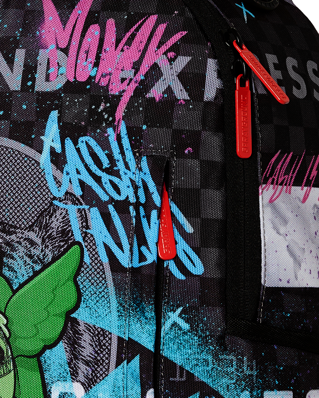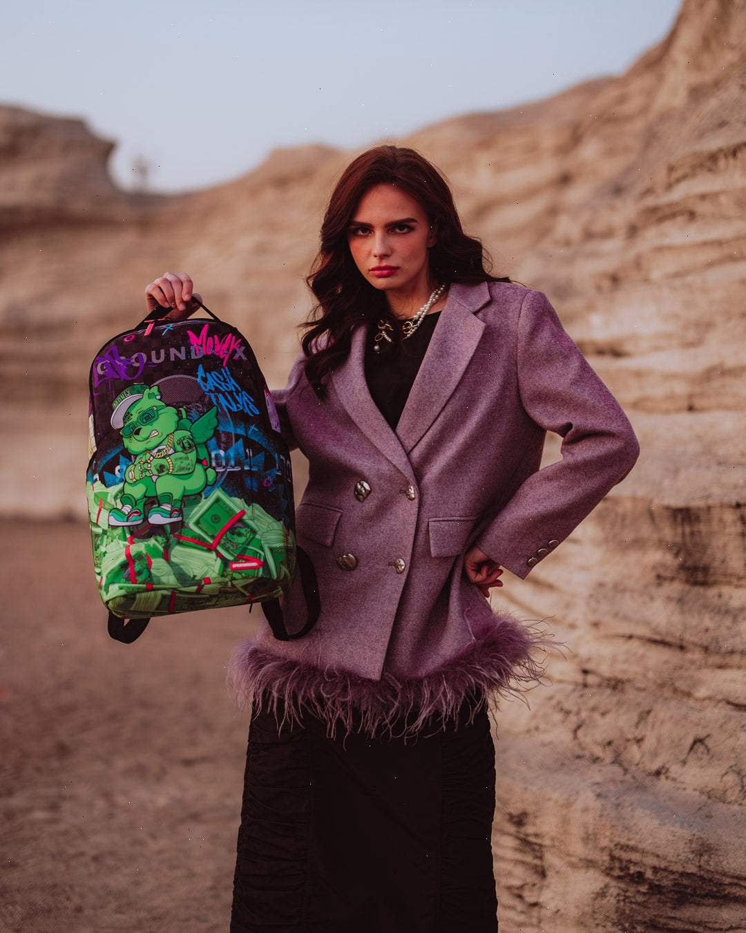 Dimensions: 18" x 6" x 11.5" ? Front zipper pocket ? Side pockets ? Zippered Stash pocket ? Separate velour sunglass compartment ? Ergonomic mesh back padding ? Adjustable Straps for custom sizing ? Gold zippers with metal hardware ? Metal "Sprayground Authentic" badge ? Slide through back sleeve connects to carry-on luggage to free your hands