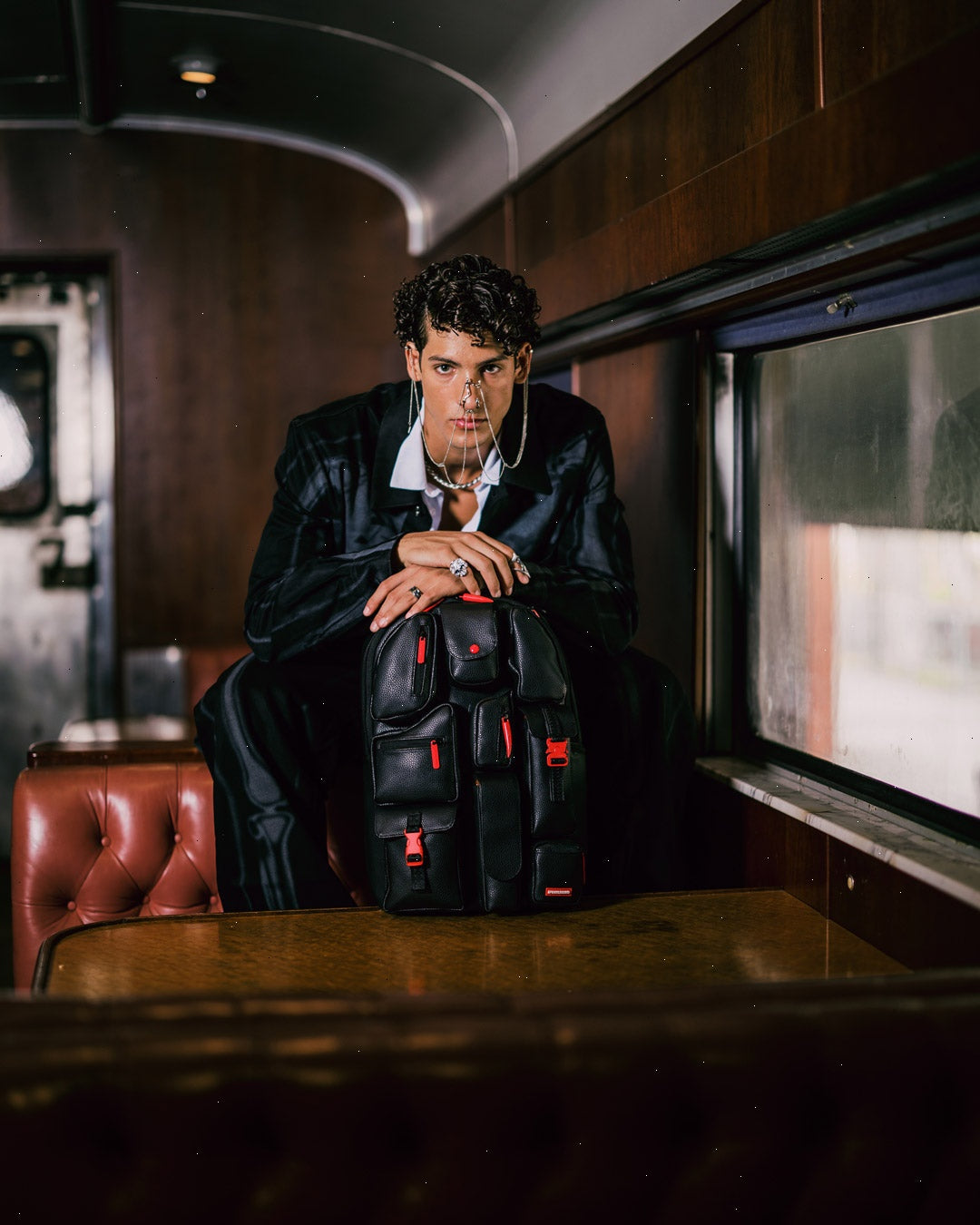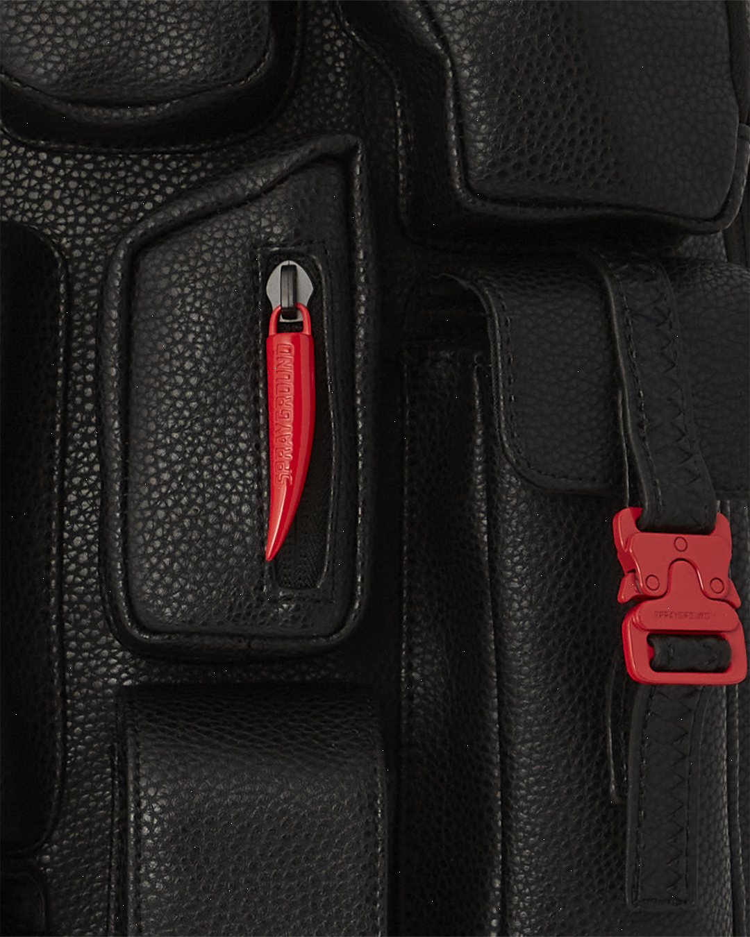 Dimensions: 18" x 6" x 11.5" ? Front zipper pocket ? Side pockets ? Zippered Stash pocket ? Separate velour sunglass compartment ? Ergonomic mesh back padding ? Adjustable Straps for custom sizing ? Gold zippers with metal hardware ? Metal "Sprayground Authentic" badge ? Slide through back sleeve connects to carry-on luggage to free your hands