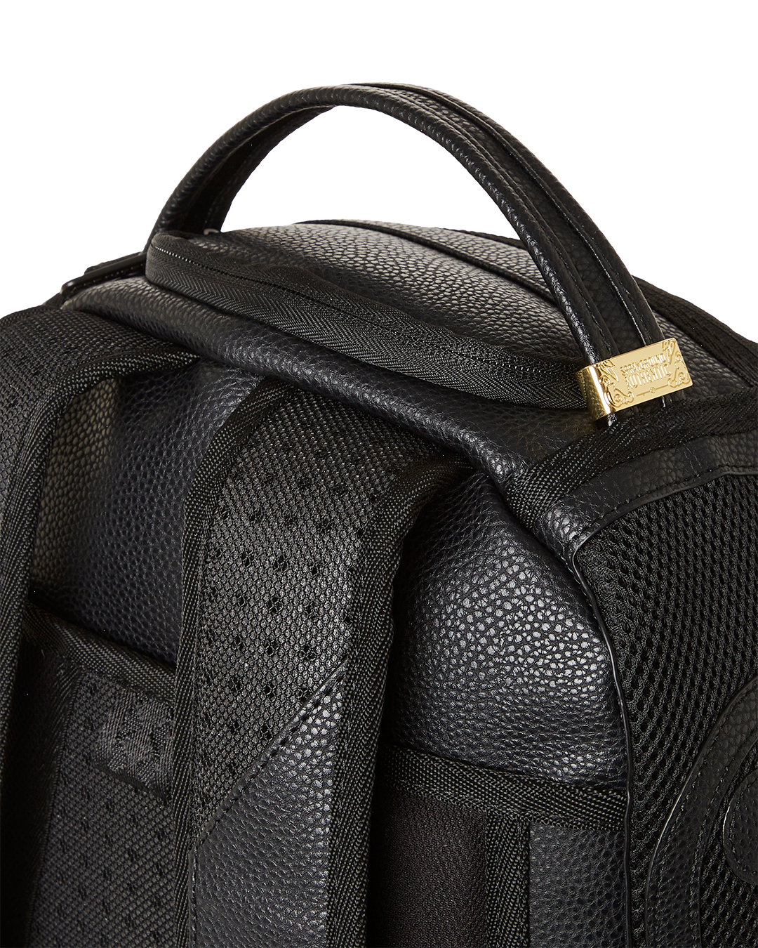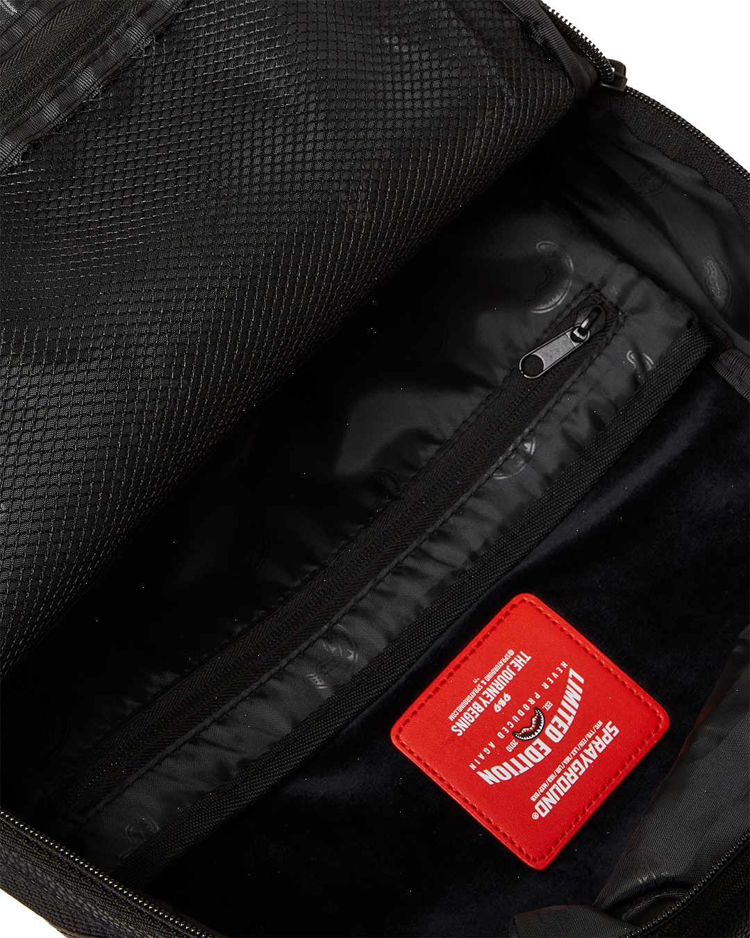 Dimensions: 18" x 6" x 11.5" ? Front zipper pocket ? Side pockets ? Zippered Stash pocket ? Separate velour sunglass compartment ? Ergonomic mesh back padding ? Adjustable Straps for custom sizing ? Gold zippers with metal hardware ? Metal "Sprayground Authentic" badge ? Slide through back sleeve connects to carry-on luggage to free your hands