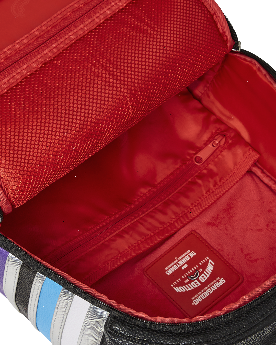 Dimensions: 18" x 6" x 11.5" ? Front zipper pocket ? Side pockets ? Zippered Stash pocket ? Separate velour sunglass compartment ? Ergonomic mesh back padding ? Adjustable Straps for custom sizing ? Gold zippers with metal hardware ? Metal "Sprayground Authentic" badge ? Slide through back sleeve connects to carry-on luggage to free your hands