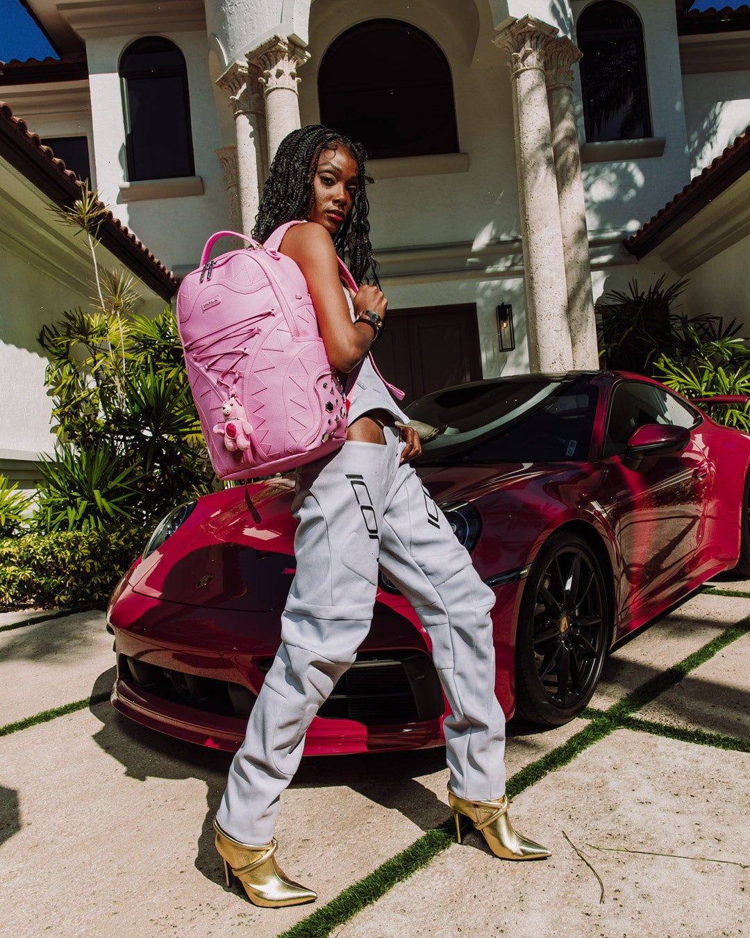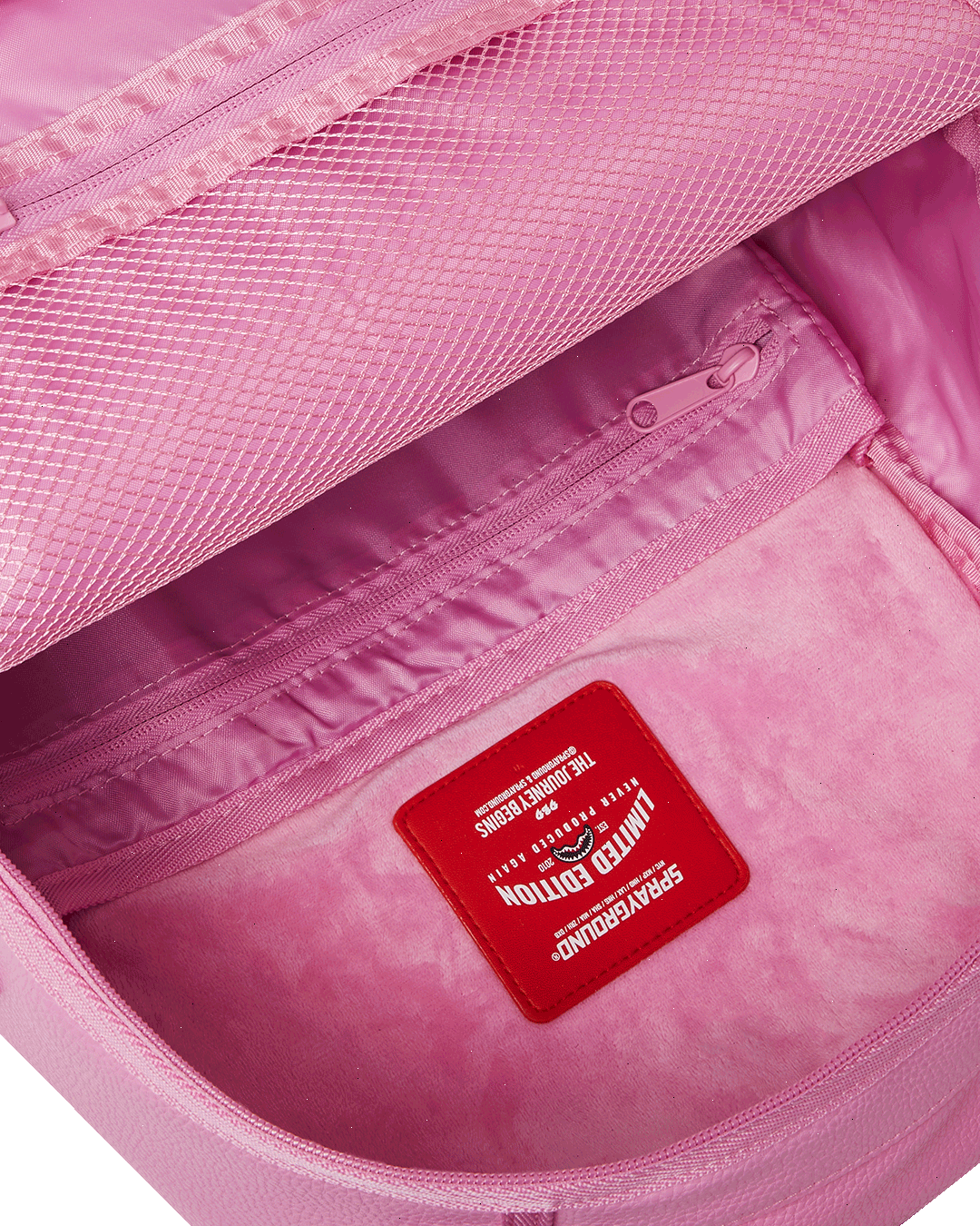 Dimensions: 18" x 6" x 11.5" ? Front zipper pocket ? Side pockets ? Zippered Stash pocket ? Separate velour sunglass compartment ? Ergonomic mesh back padding ? Adjustable Straps for custom sizing ? Gold zippers with metal hardware ? Metal "Sprayground Authentic" badge ? Slide through back sleeve connects to carry-on luggage to free your hands