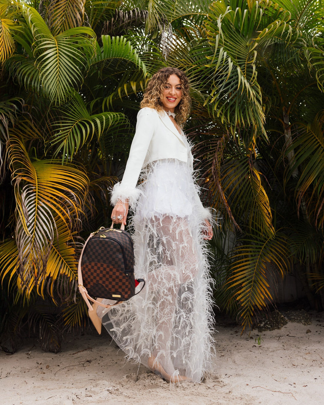Dimensions: 10" x 5" x 11.5" ? Two large main zippered compartments ? Side pockets ? Zippered Stash pocket ? Adjustable straps for custom sizing ? Gold zippers with metal hardware