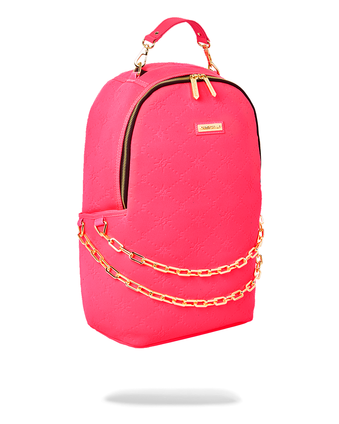 Dimensions: 18" x 6" x 11.5" ? Front zipper pocket ? Side pockets ? Zippered Stash pocket ? Separate velour sunglass compartment ? Ergonomic mesh back padding ? Adjustable Straps for custom sizing ? Gold zippers with metal hardware ? Metal "Sprayground Authentic" badge ? Slide through back sleeve connects to carry-on luggage to free your hands