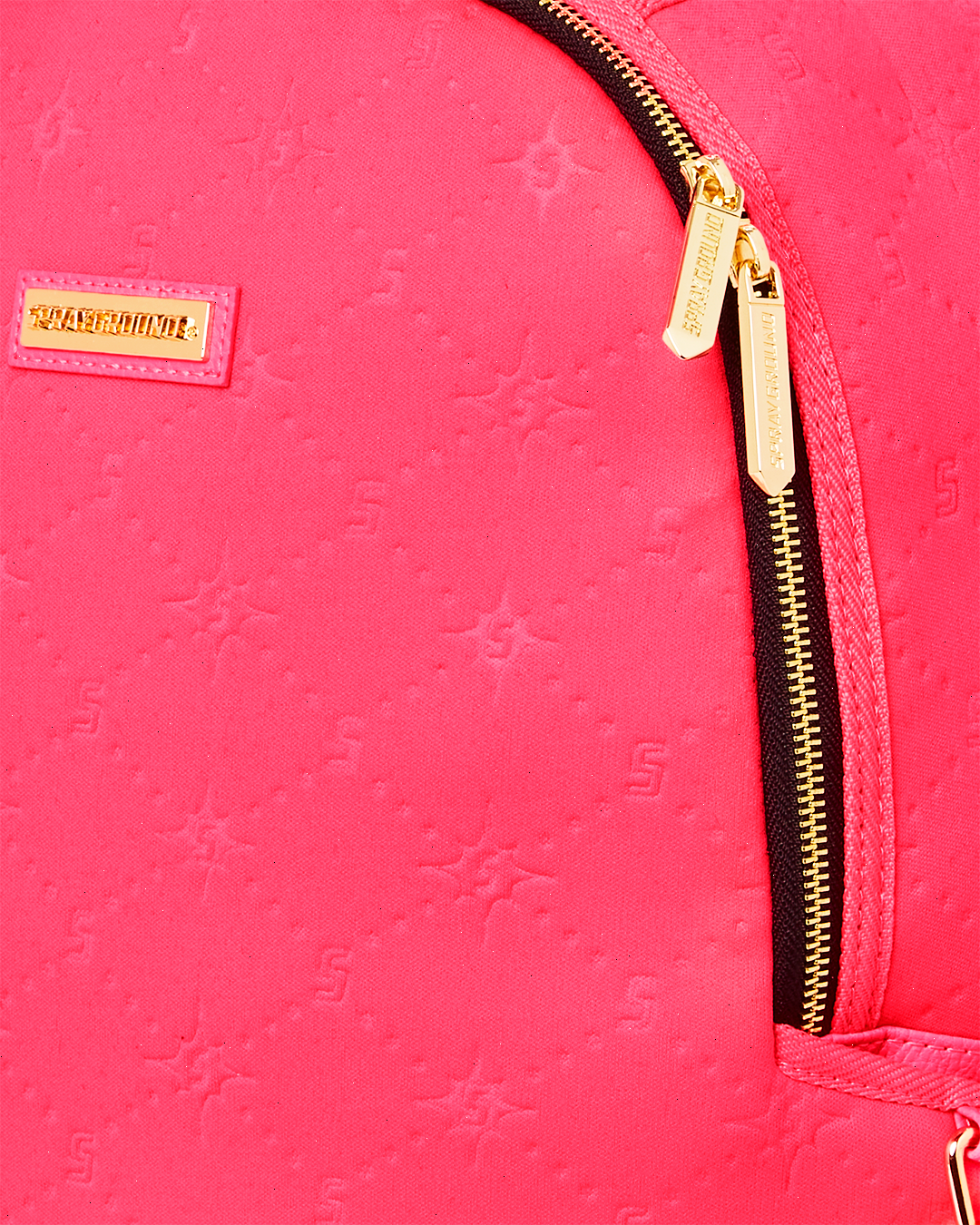 Sporty neoprene fabric embossed with custom Sprayground logo pattern.