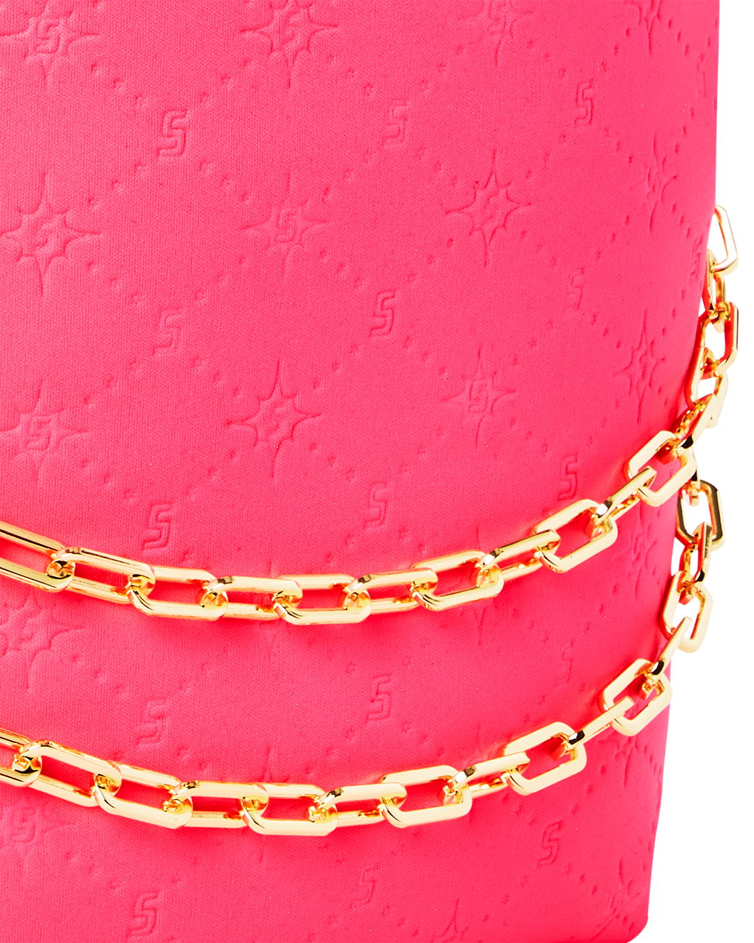 The styles are trimmed with matching faux leather trims and elevated with gold chain accents and gold hardware