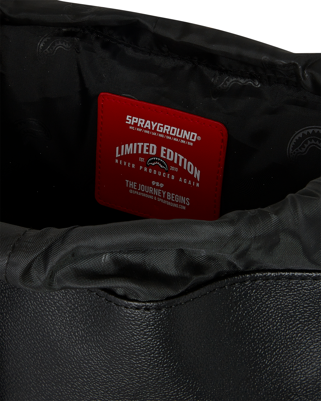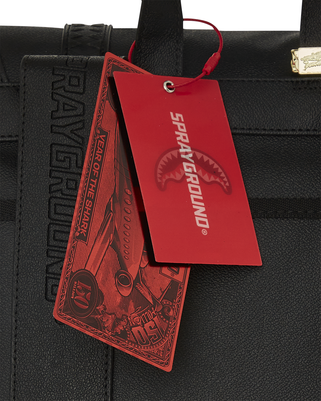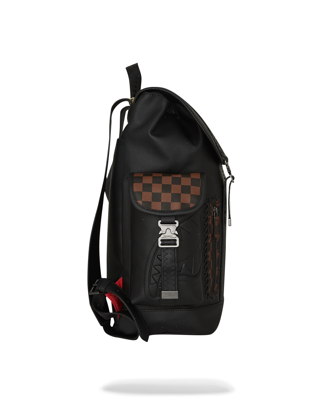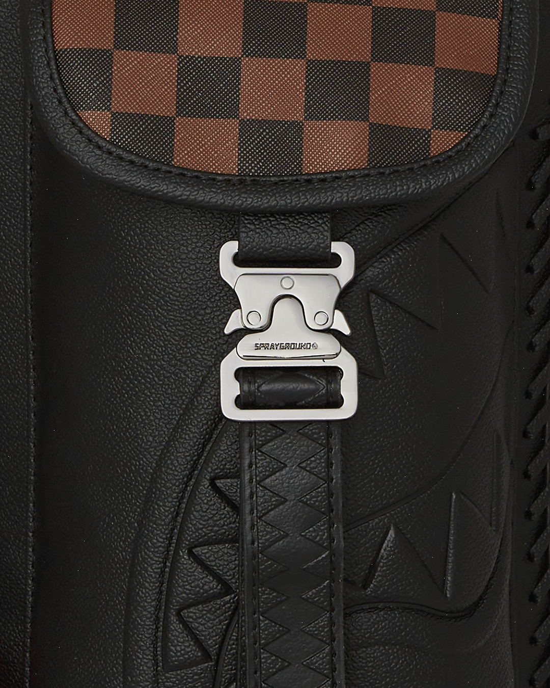 PVC bag with embossed details such as the sharkmouth and zipper pullers. Sewn faux leather details around the front zipper pocket.