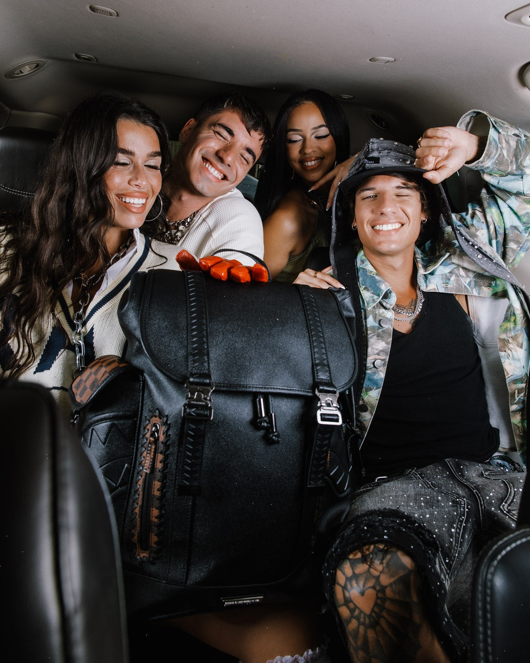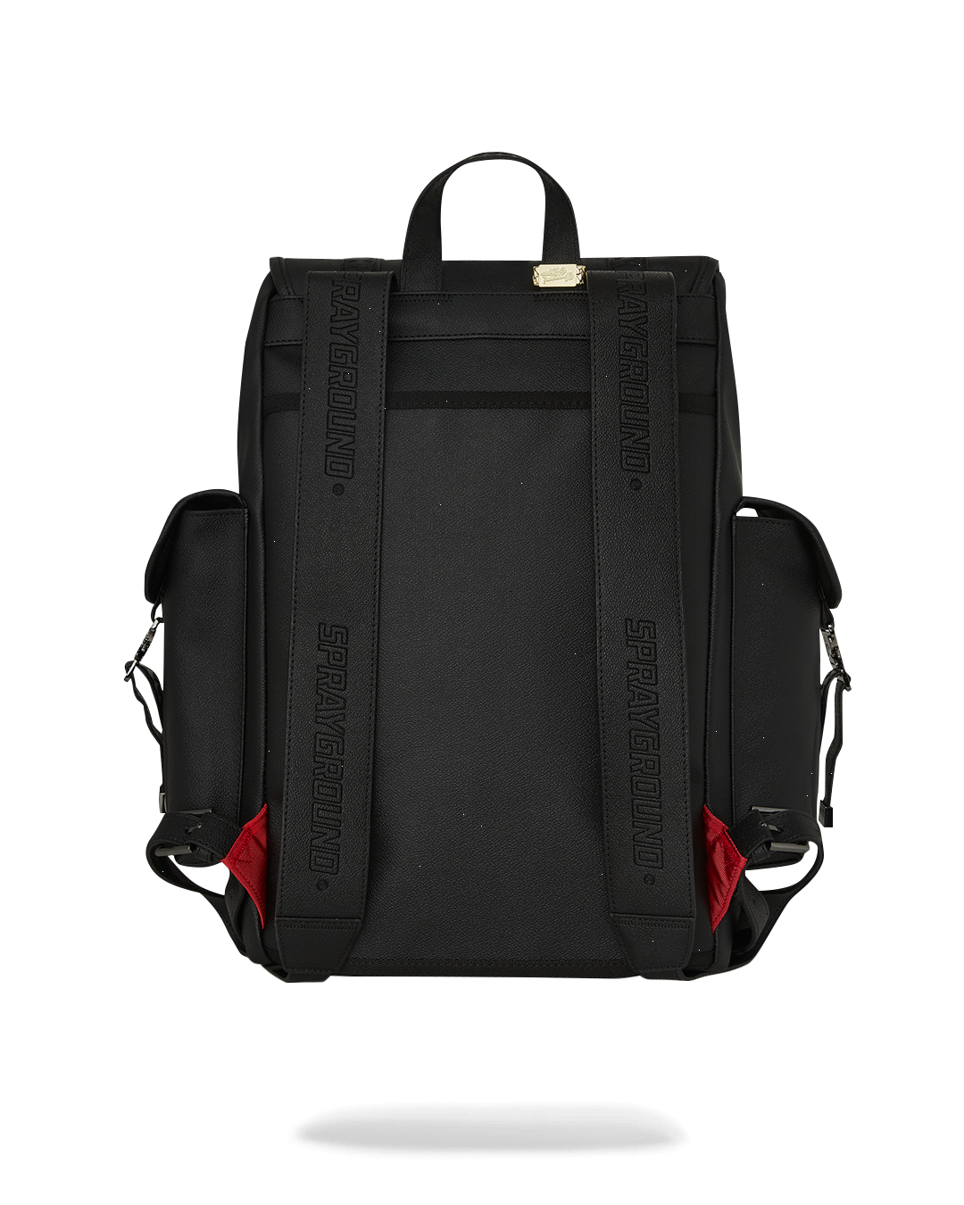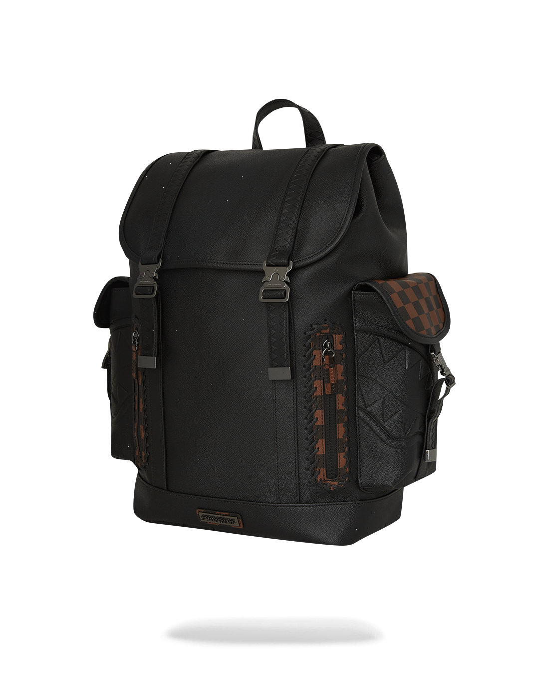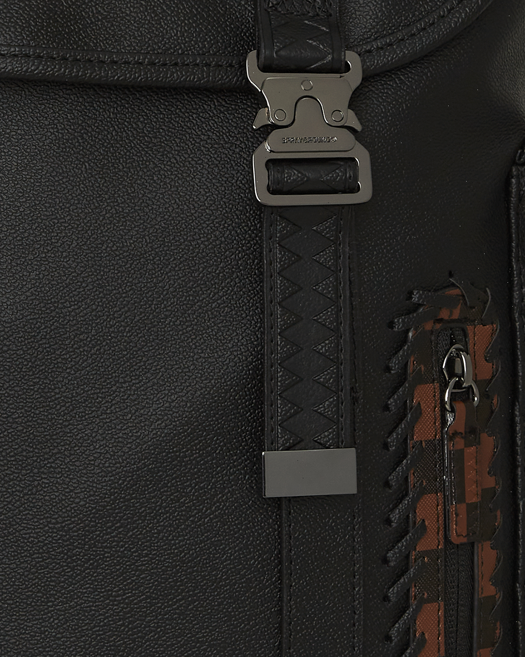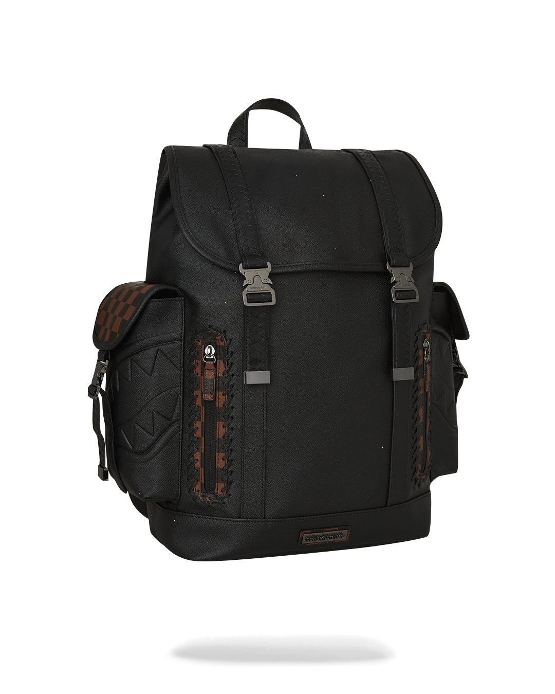 PVC bag with embossed details such as the sharkmouth and zipper pullers. Sewn faux leather details around the front zipper pocket.