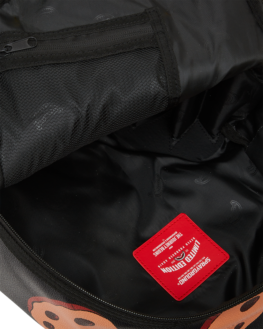 Dimensions: 18" x 6" x 11.5" ? Front zipper pocket ? Side pockets ? Zippered Stash pocket ? Separate velour sunglass compartment ? Ergonomic mesh back padding ? Adjustable Straps for custom sizing ? Gold zippers with metal hardware ? Metal "Sprayground Authentic" badge ? Slide through back sleeve connects to carry-on luggage to free your hands
