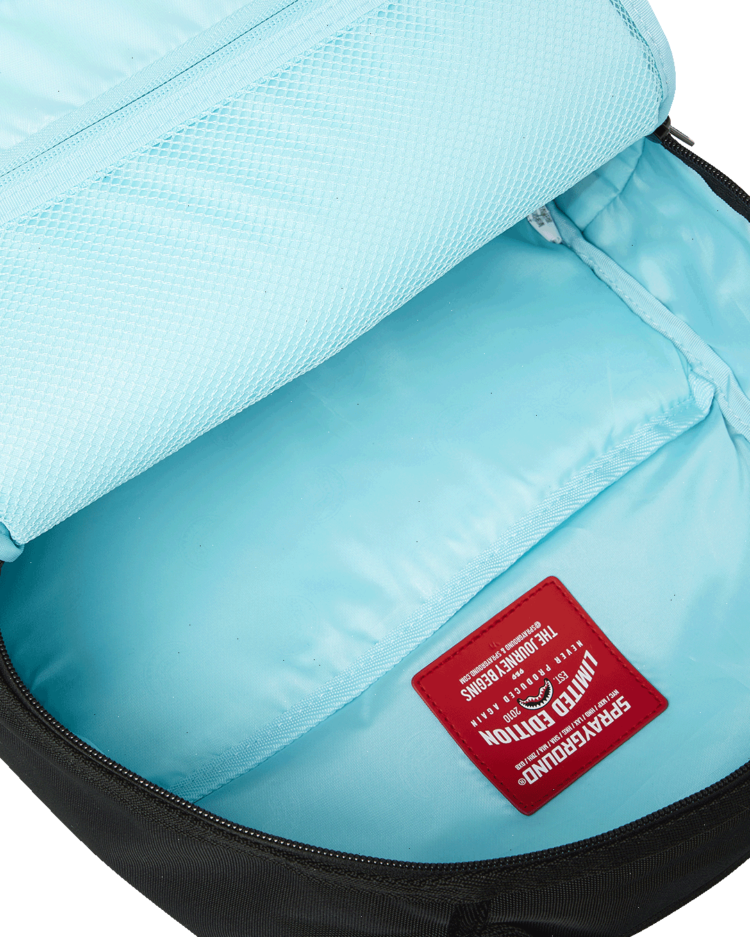 Dimensions: 18" x 6" x 11.5" ? Front zipper pocket ? Side pockets ? Zippered Stash pocket ? Separate velour sunglass compartment ? Ergonomic mesh back padding ? Adjustable Straps for custom sizing ? Gold zippers with metal hardware ? Metal "Sprayground Authentic" badge ? Slide through back sleeve connects to carry-on luggage to free your hands