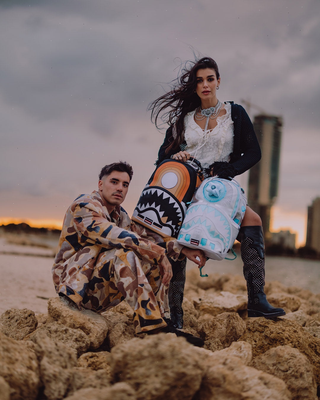 Dimensions: 18" x 6" x 11.5" ? Front zipper pocket ? Side pockets ? Zippered Stash pocket ? Separate velour sunglass compartment ? Ergonomic mesh back padding ? Adjustable Straps for custom sizing ? Gold zippers with metal hardware ? Metal "Sprayground Authentic" badge ? Slide through back sleeve connects to carry-on luggage to free your hands