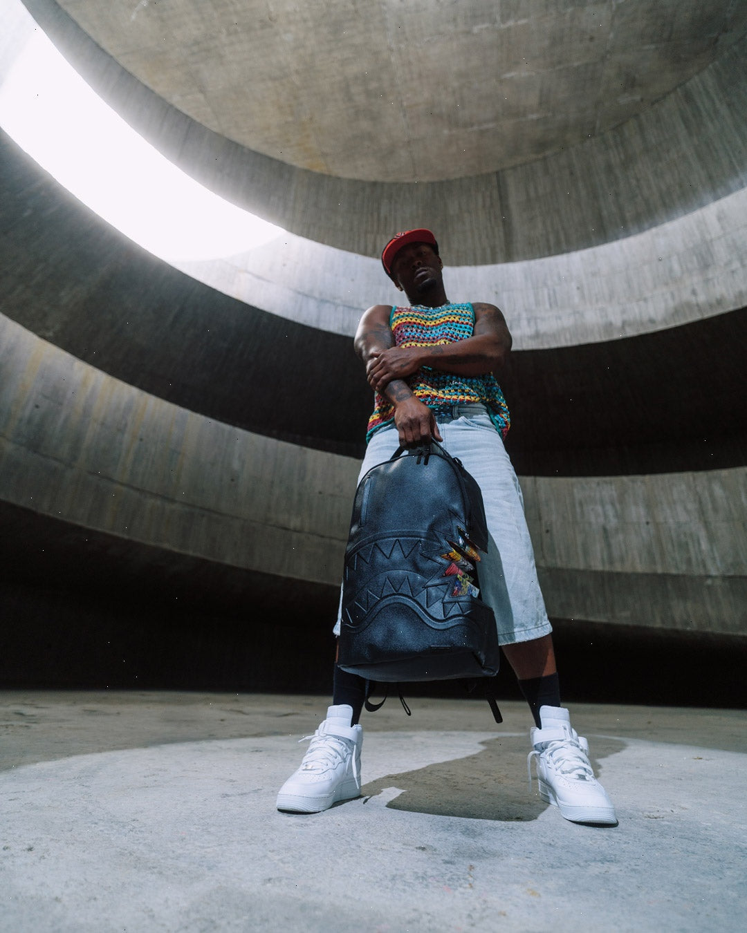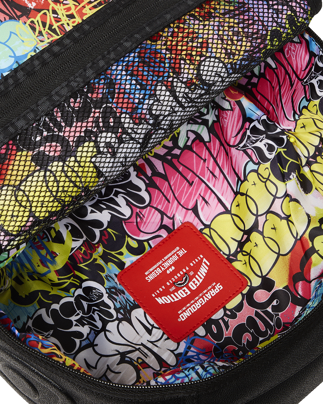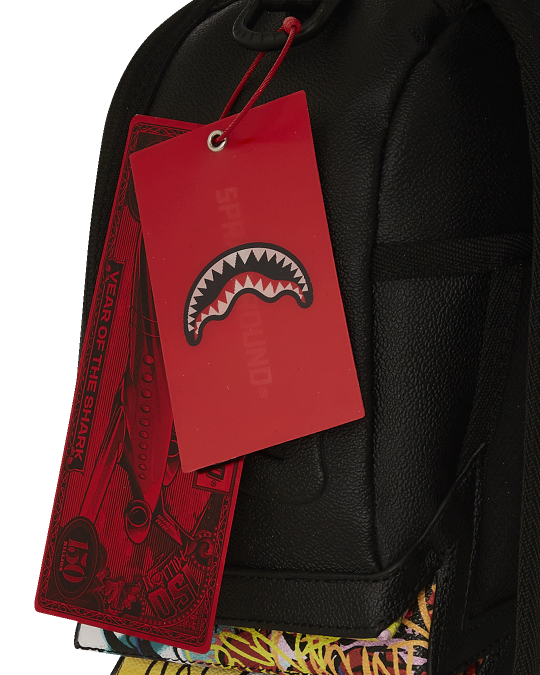 Dimensions: 18" x 6" x 11.5" ? Front zipper pocket ? Side pockets ? Zippered Stash pocket ? Separate velour sunglass compartment ? Ergonomic mesh back padding ? Adjustable Straps for custom sizing ? Gold zippers with metal hardware ? Metal "Sprayground Authentic" badge ? Slide through back sleeve connects to carry-on luggage to free your hands