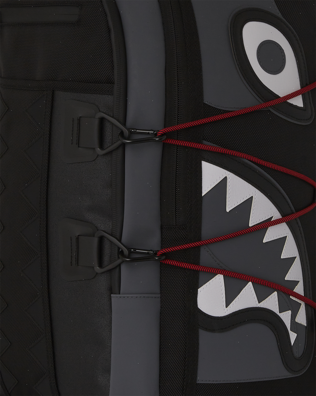 Deep front pocket, extra front pocket, paracord detailing on the sides, rubber Sharkmouth and eye details, 2.5" deeper than a normal bag