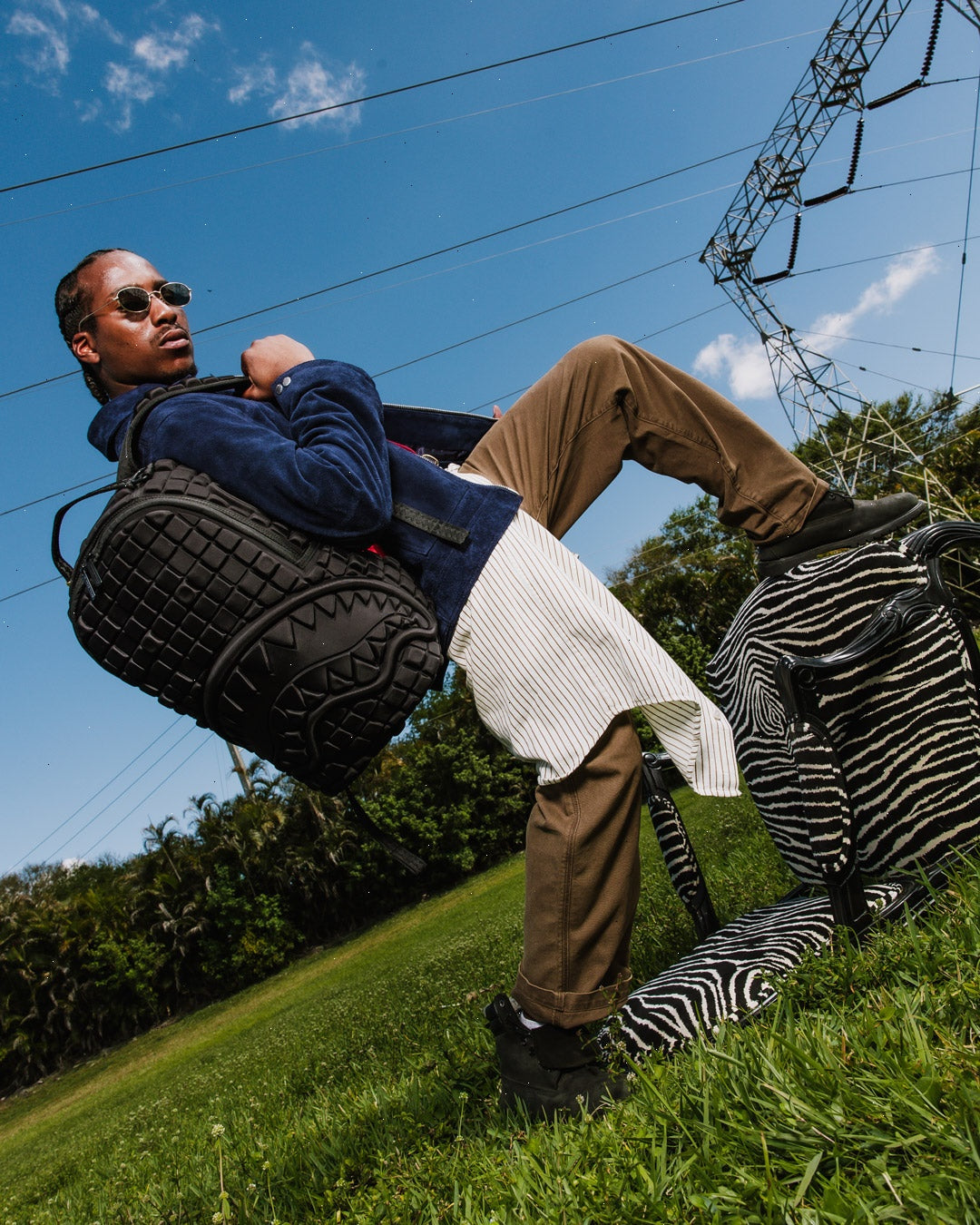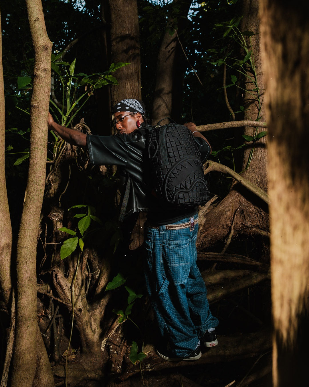 Dimensions: 18" x 6" x 11.5" ? Front zipper pocket ? Side pockets ? Zippered Stash pocket ? Separate velour sunglass compartment ? Ergonomic mesh back padding ? Adjustable Straps for custom sizing ? Gold zippers with metal hardware ? Metal "Sprayground Authentic" badge ? Slide through back sleeve connects to carry-on luggage to free your hands