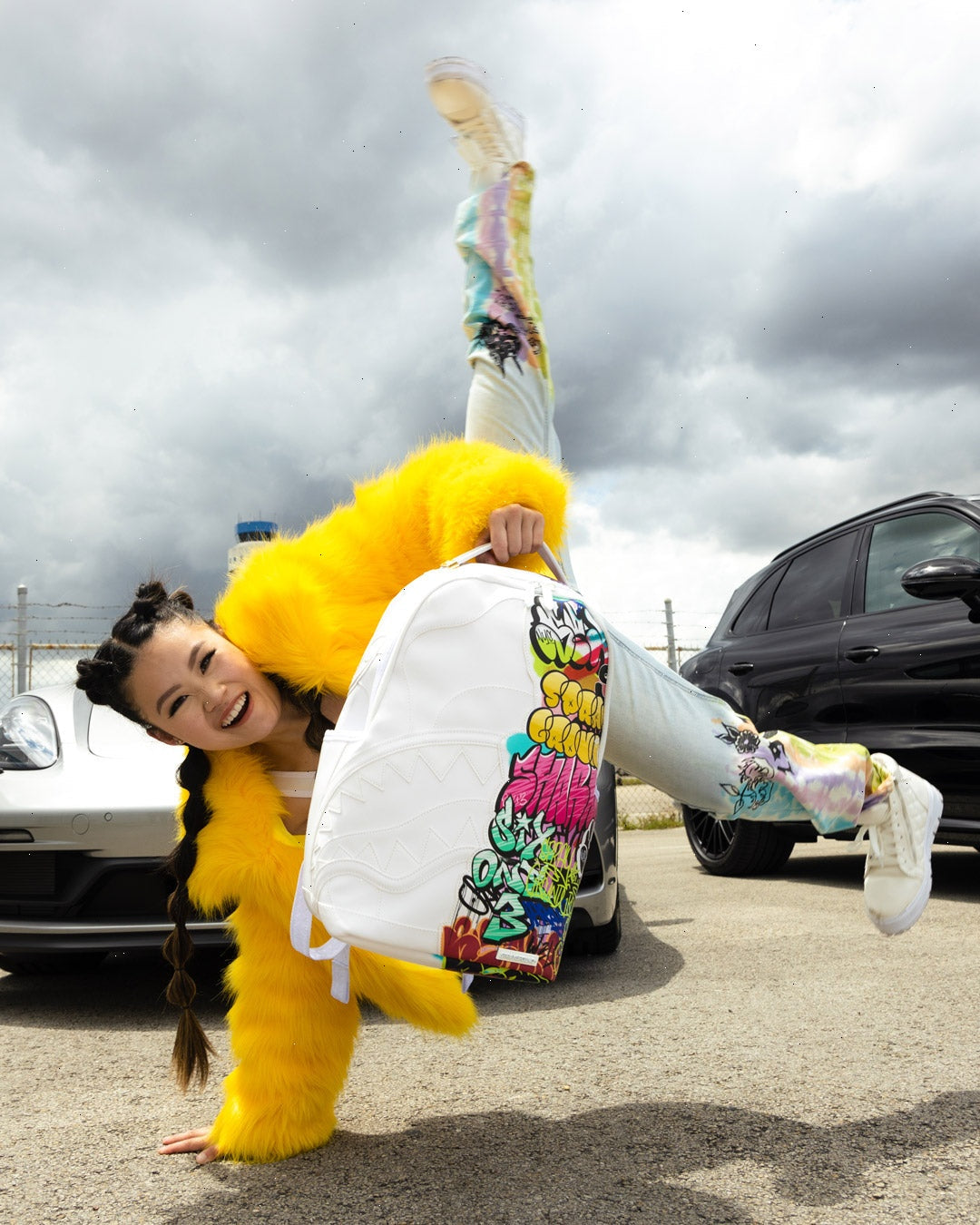 Dimensions: 18" x 6" x 11.5" ? Front zipper pocket ? Side pockets ? Zippered Stash pocket ? Separate velour sunglass compartment ? Ergonomic mesh back padding ? Adjustable Straps for custom sizing ? Gold zippers with metal hardware ? Metal "Sprayground Authentic" badge ? Slide through back sleeve connects to carry-on luggage to free your hands