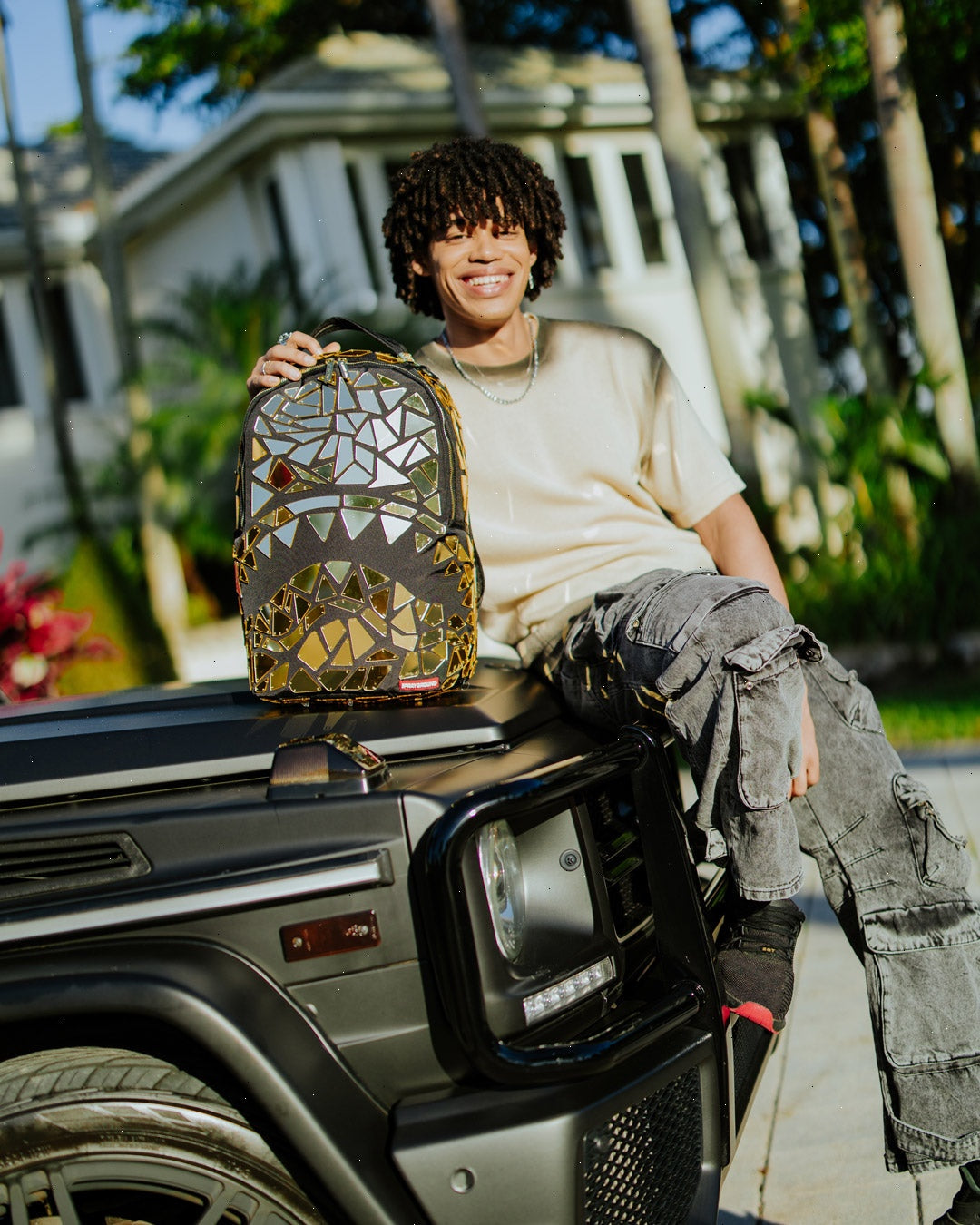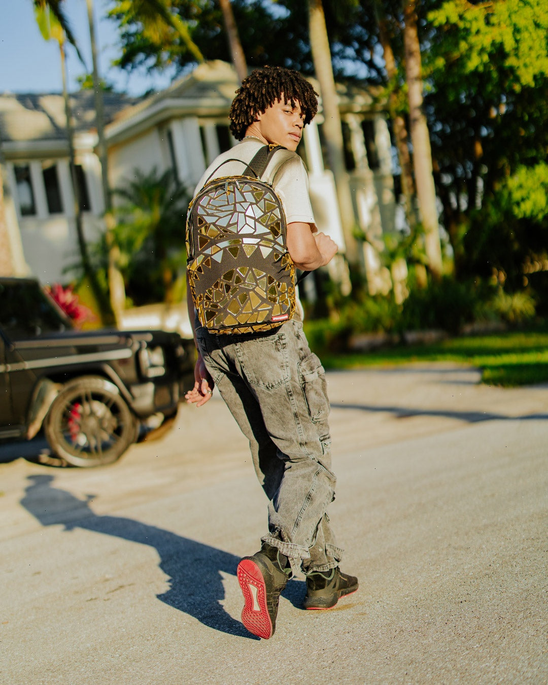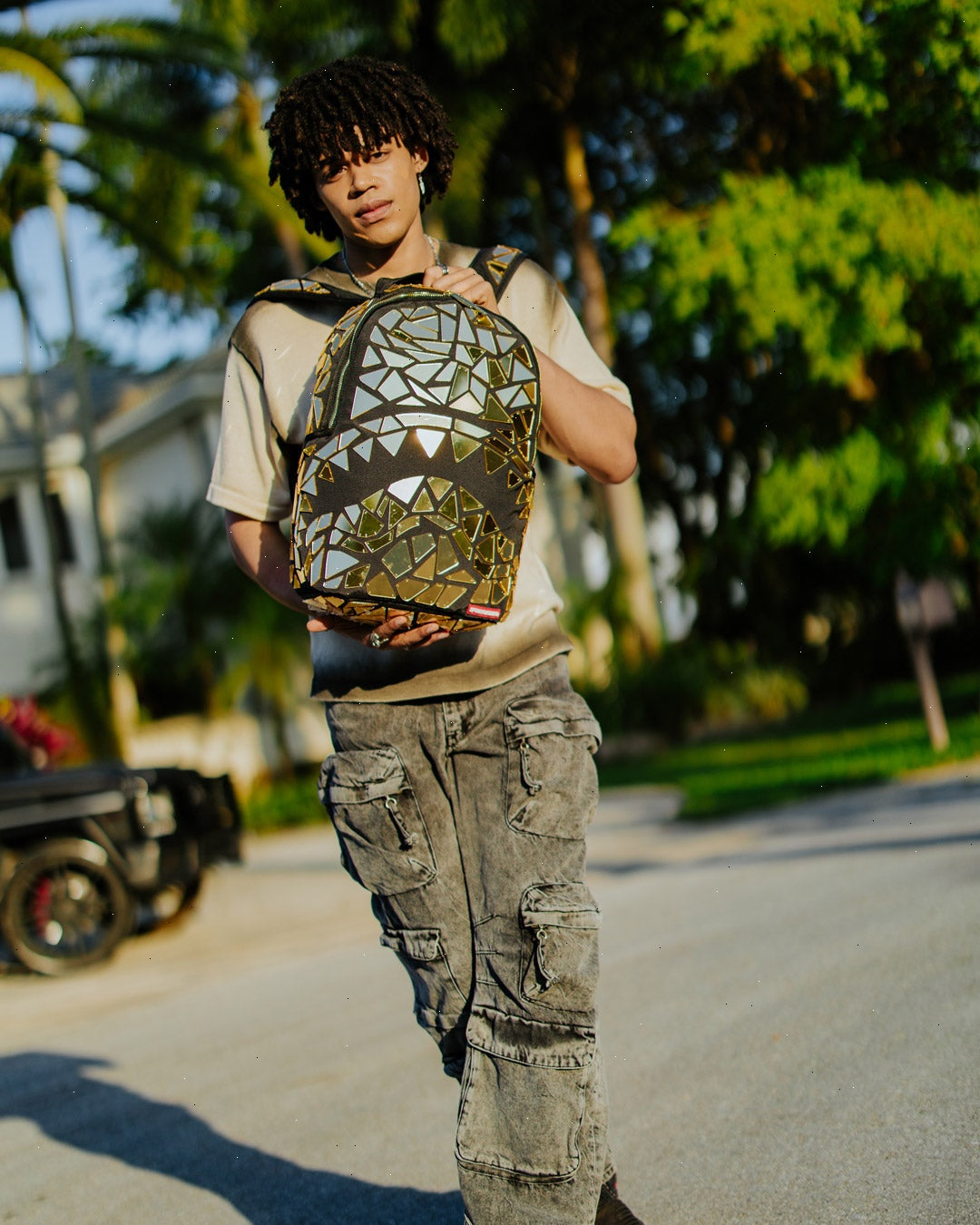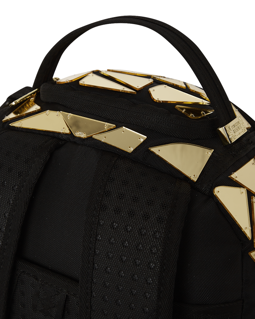 Dimensions: 18" x 6" x 11.5" ? Front zipper pocket ? Side pockets ? Zippered Stash pocket ? Separate velour sunglass compartment ? Ergonomic mesh back padding ? Adjustable Straps for custom sizing ? Gold zippers with metal hardware ? Metal "Sprayground Authentic" badge ? Slide through back sleeve connects to carry-on luggage to free your hands