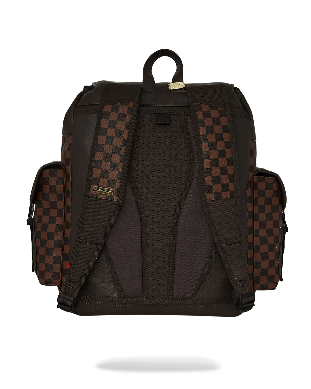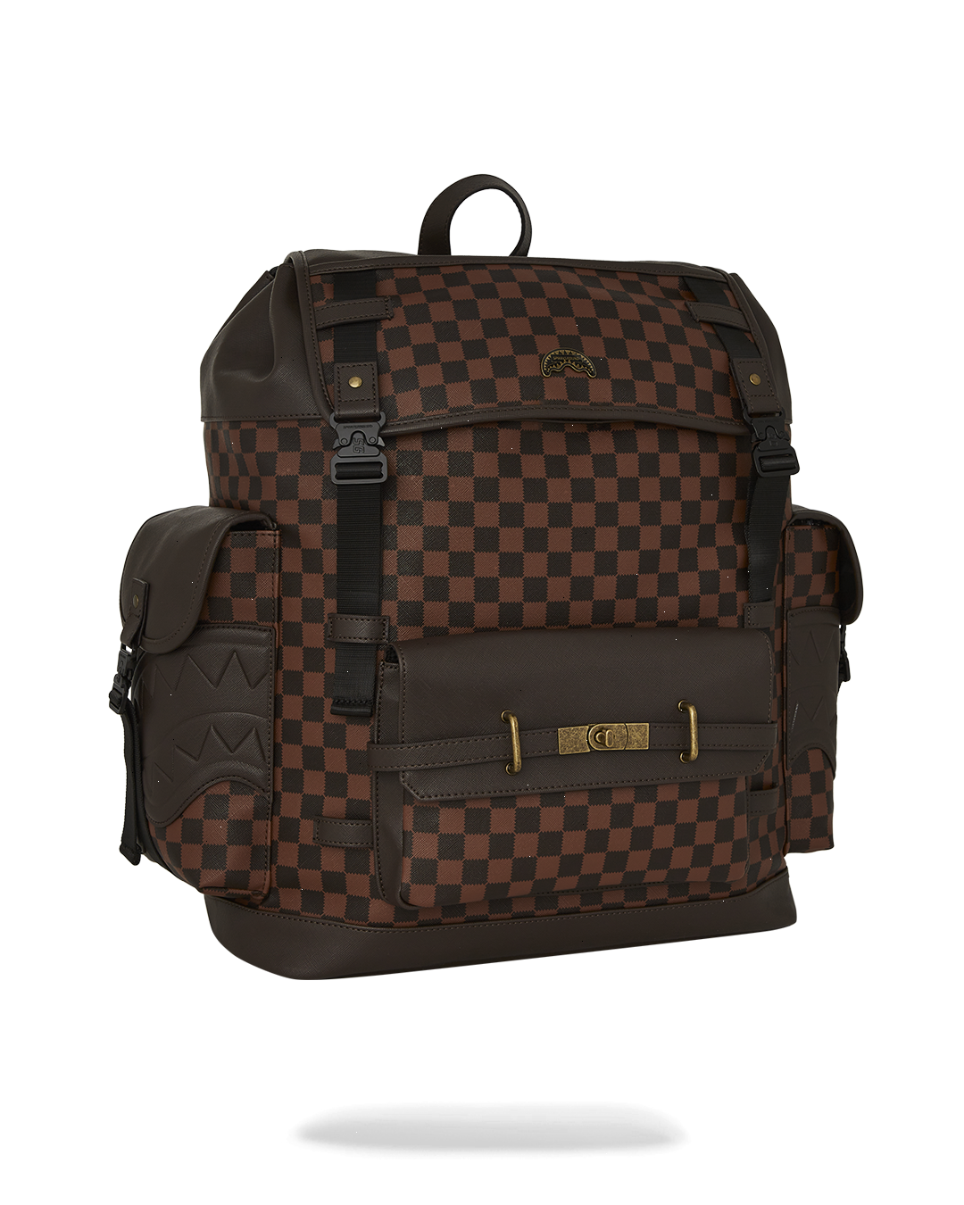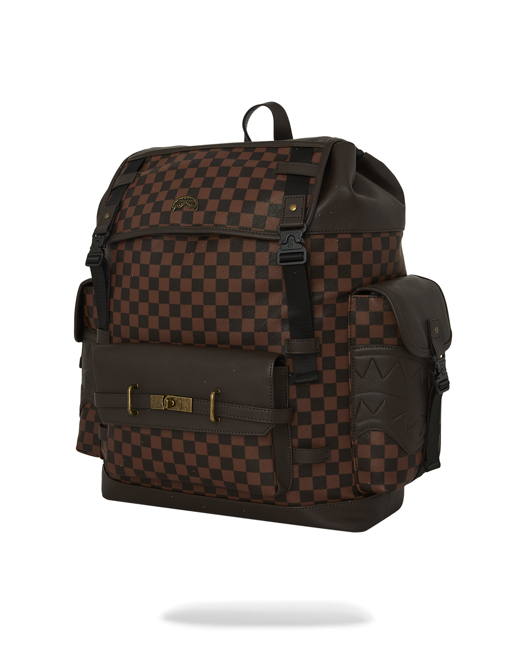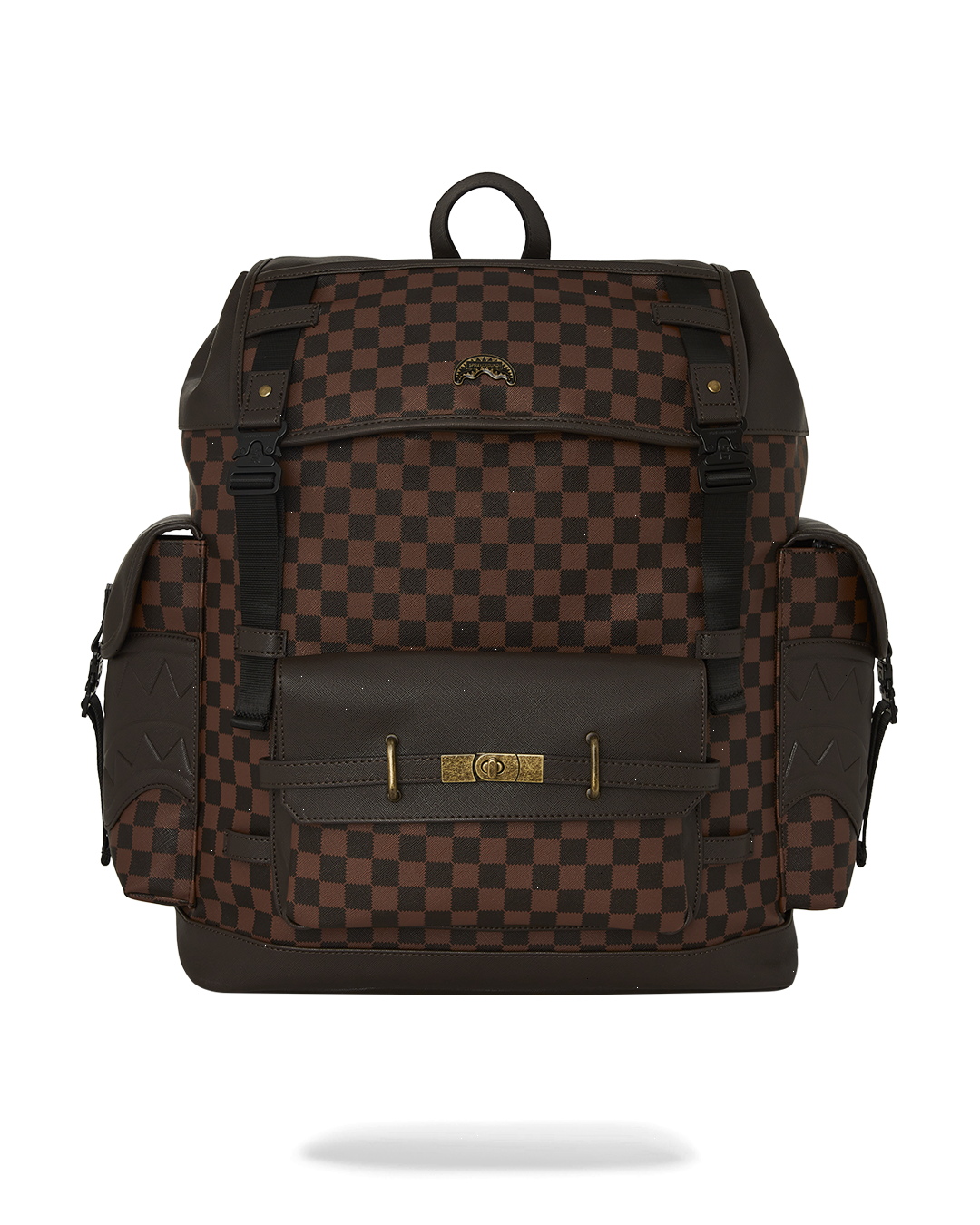 Dimensions: 18" x 6" x 11.5" ? Front zipper pocket ? Side pockets ? Zippered Stash pocket ? Separate velour sunglass compartment ? Ergonomic mesh back padding ? Adjustable Straps for custom sizing ? Gold zippers with metal hardware ? Metal "Sprayground Authentic" badge ? Slide through back sleeve connects to carry-on luggage to free your hands
