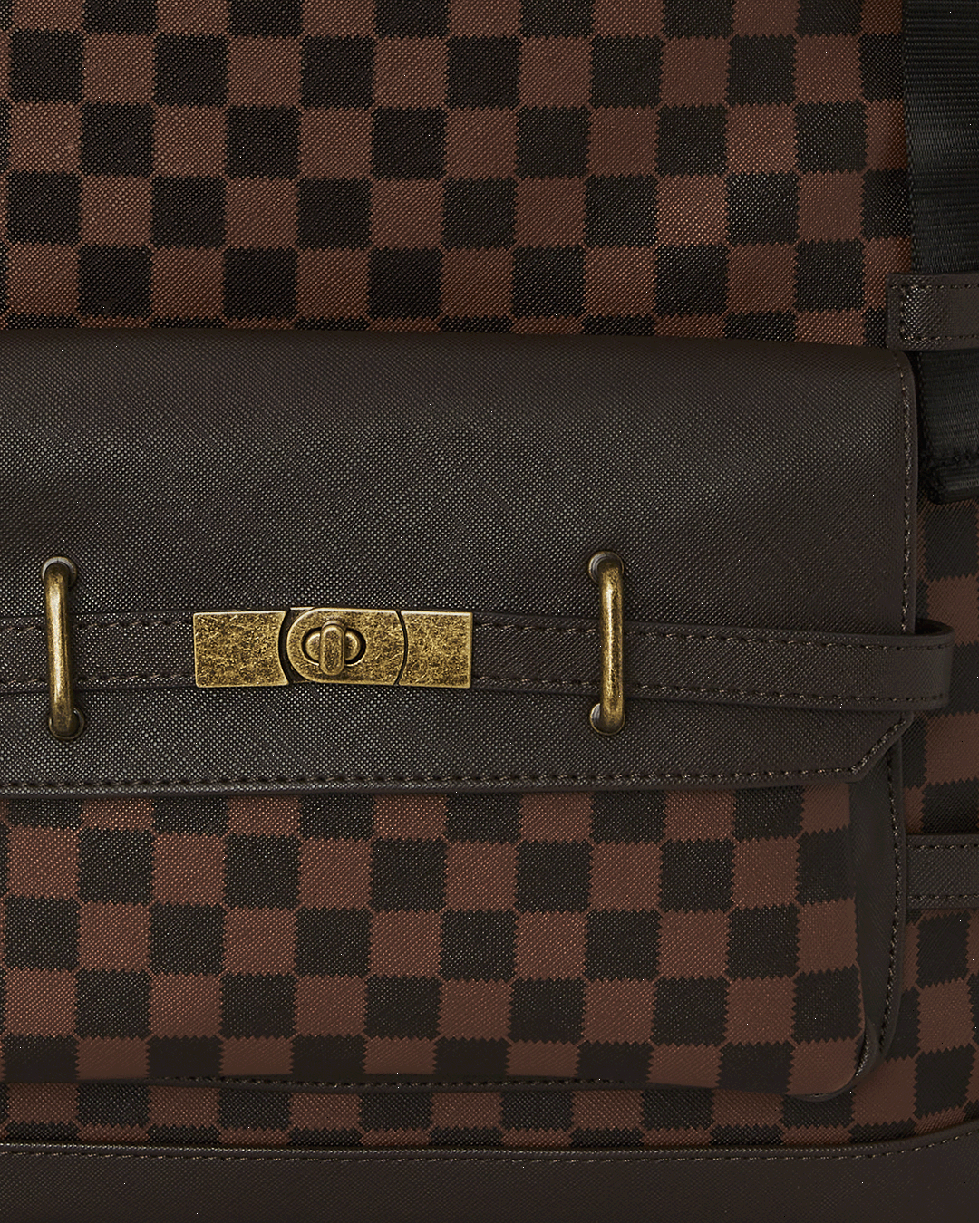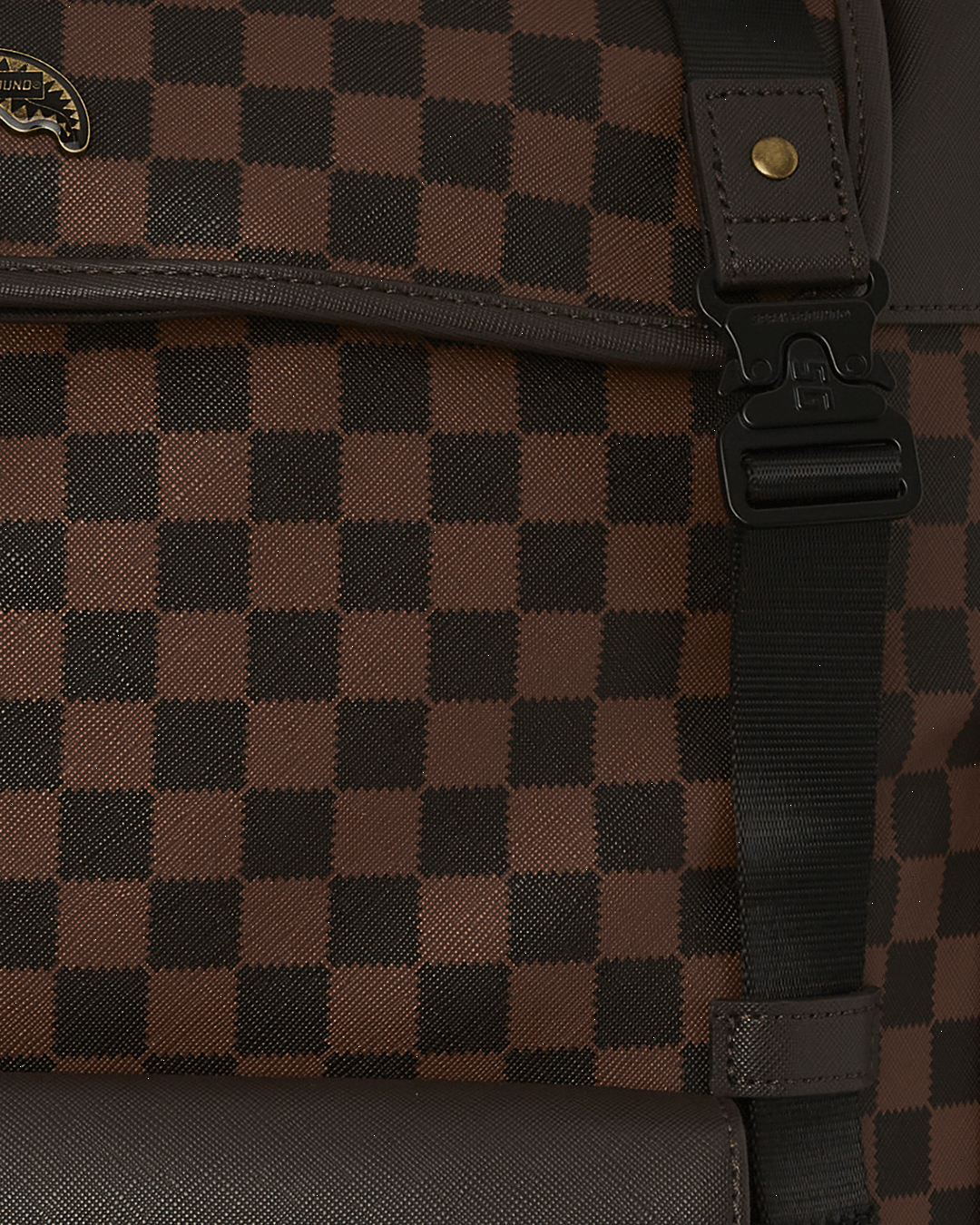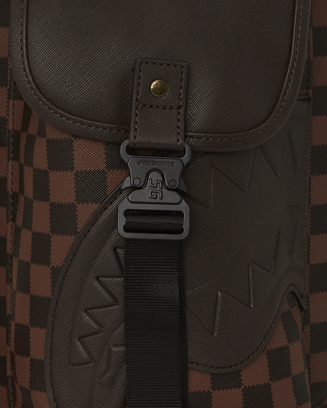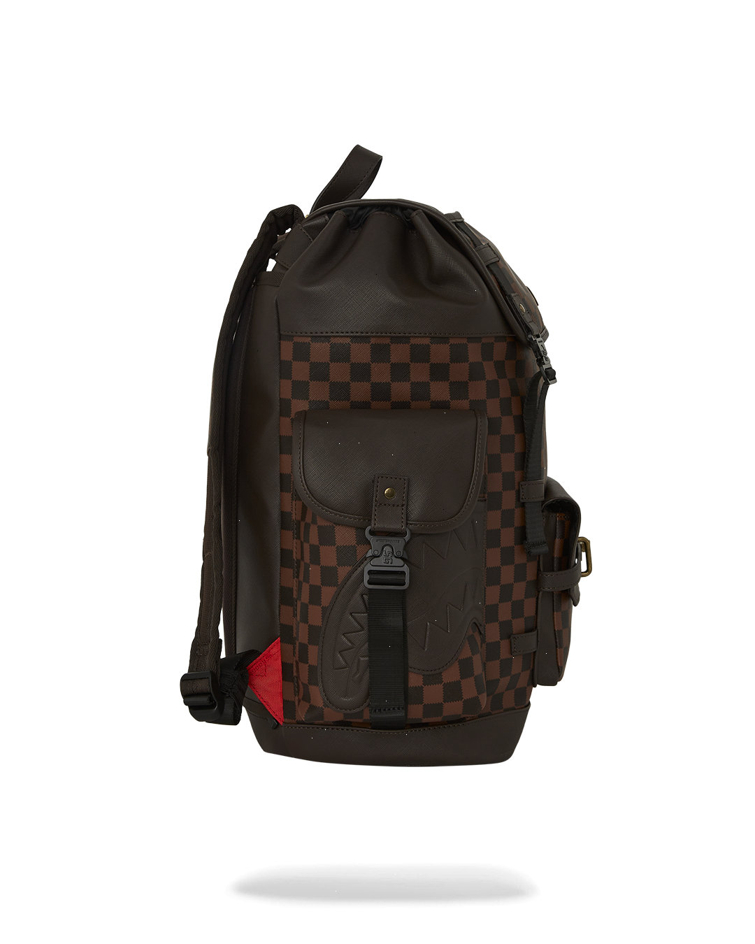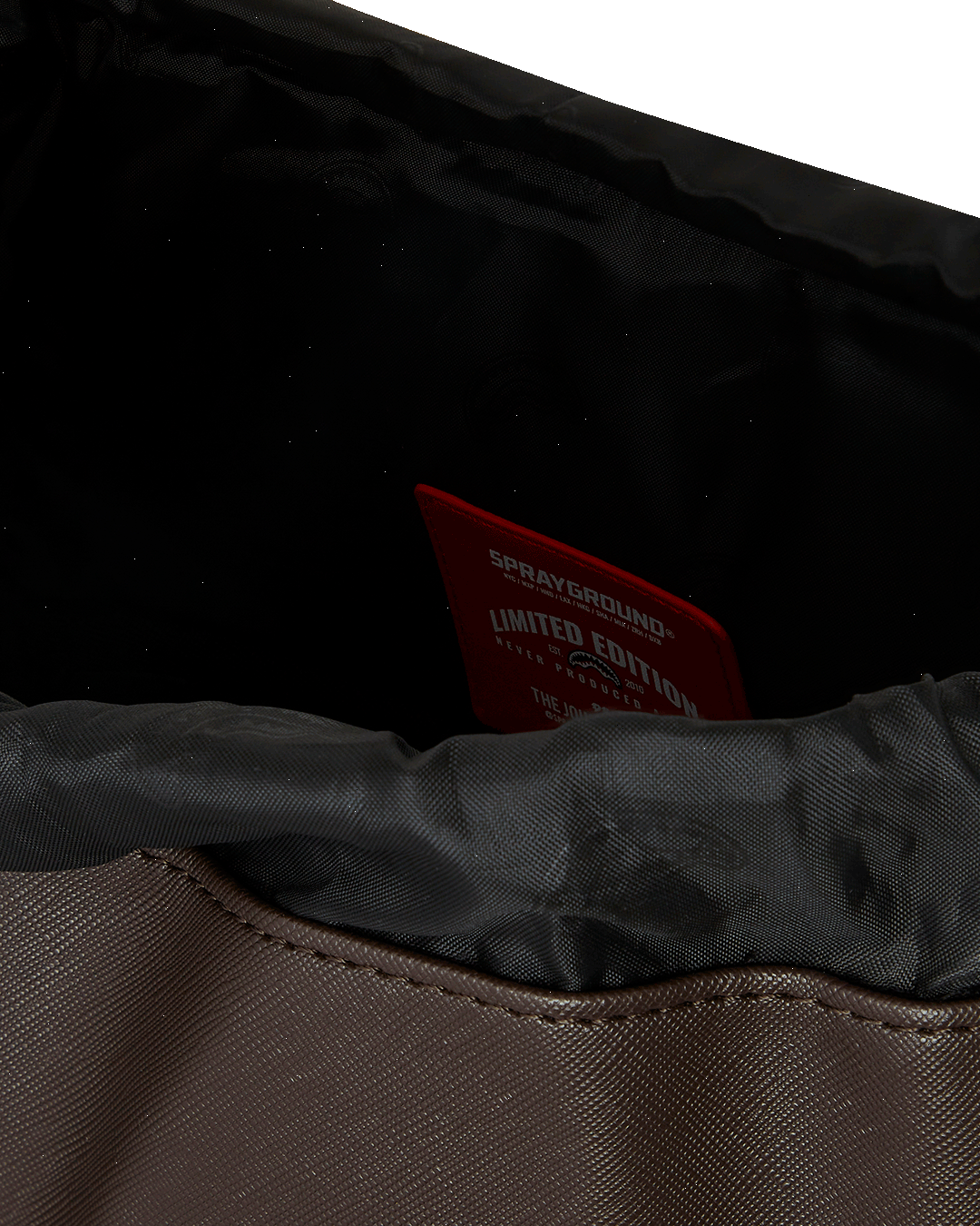 Dimensions: 18" x 6" x 11.5" ? Front zipper pocket ? Side pockets ? Zippered Stash pocket ? Separate velour sunglass compartment ? Ergonomic mesh back padding ? Adjustable Straps for custom sizing ? Gold zippers with metal hardware ? Metal "Sprayground Authentic" badge ? Slide through back sleeve connects to carry-on luggage to free your hands