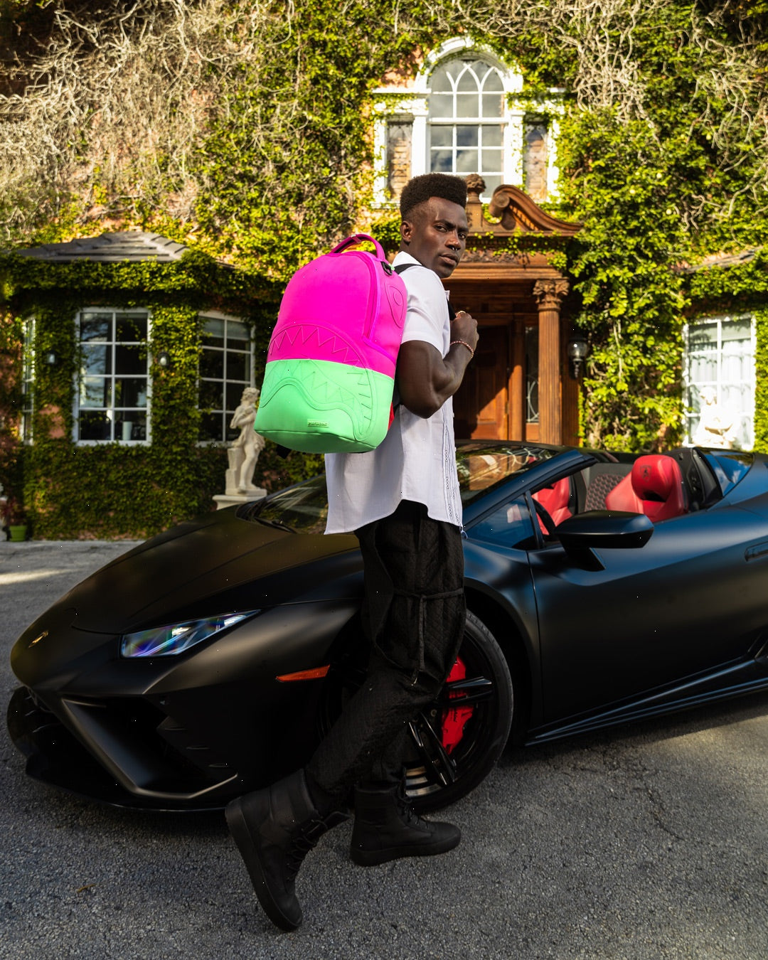 Dimensions: 18" x 6" x 11.5" ? Front zipper pocket ? Side pockets ? Zippered Stash pocket ? Separate velour sunglass compartment ? Ergonomic mesh back padding ? Adjustable Straps for custom sizing ? Gold zippers with metal hardware ? Metal "Sprayground Authentic" badge ? Slide through back sleeve connects to carry-on luggage to free your hands