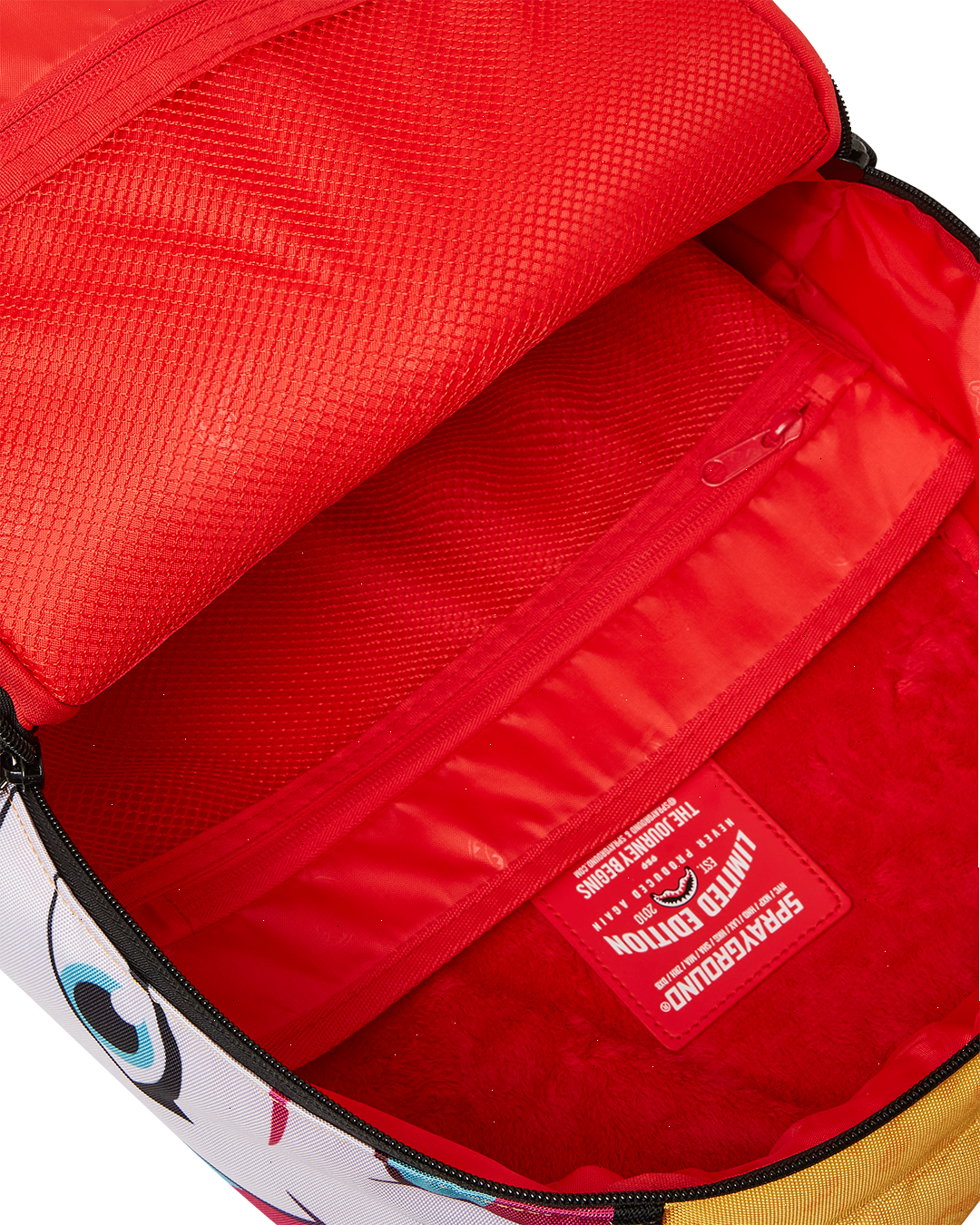 Dimensions: 18" x 6" x 11.5" ? Front zipper pocket ? Side pockets ? Zippered Stash pocket ? Separate velour sunglass compartment ? Ergonomic mesh back padding ? Adjustable Straps for custom sizing ? Gold zippers with metal hardware ? Metal "Sprayground Authentic" badge ? Slide through back sleeve connects to carry-on luggage to free your hands