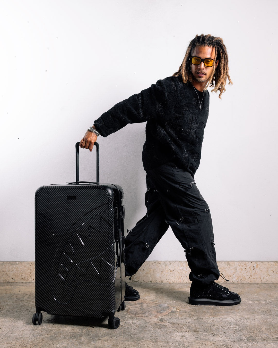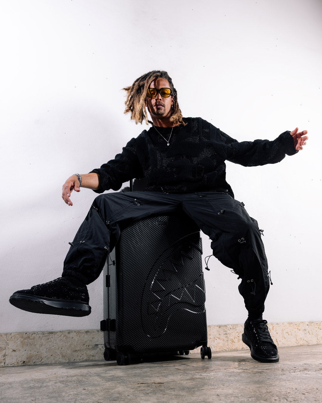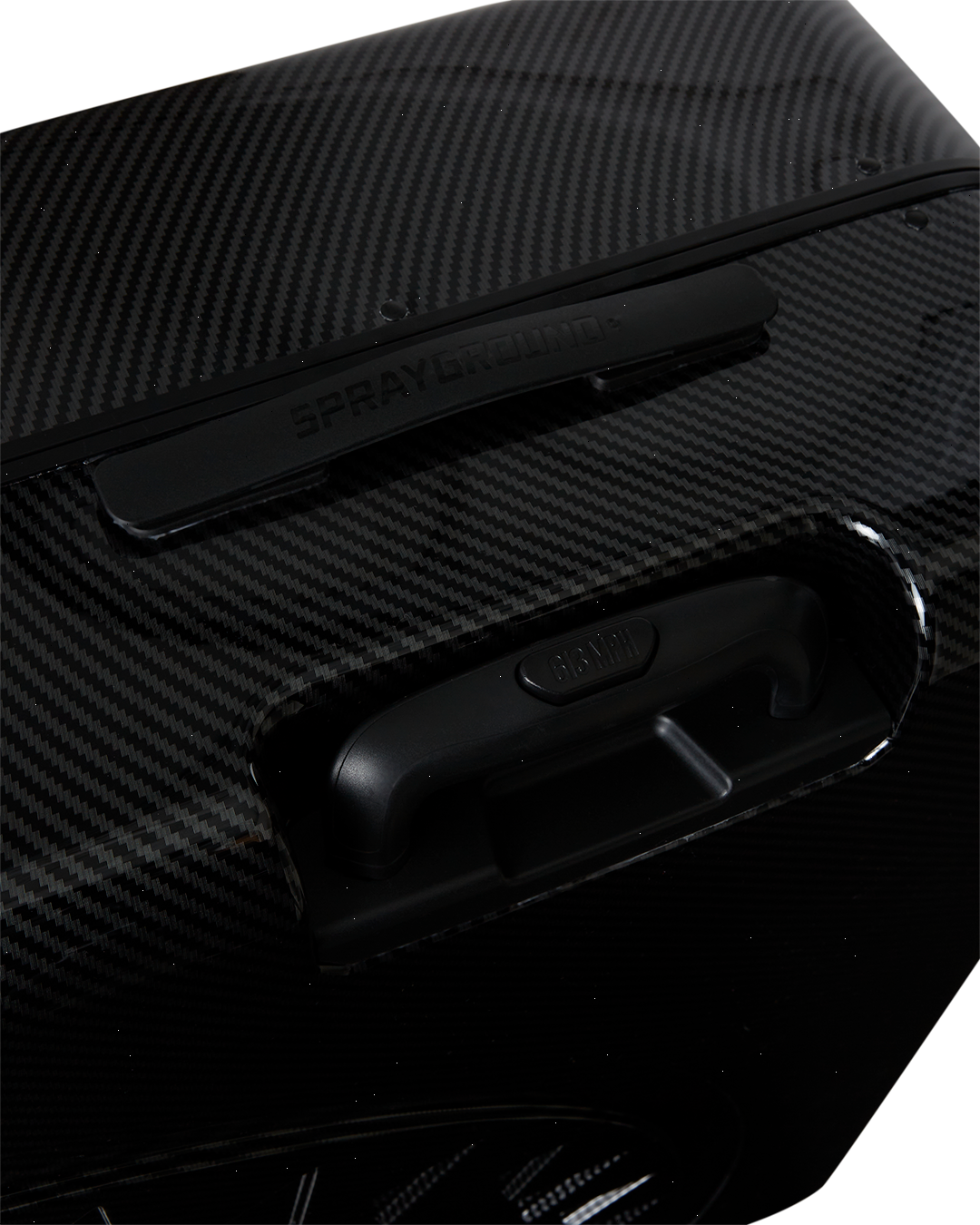Faux carbon fiber full size luggage. Features an embossed shark mouth.