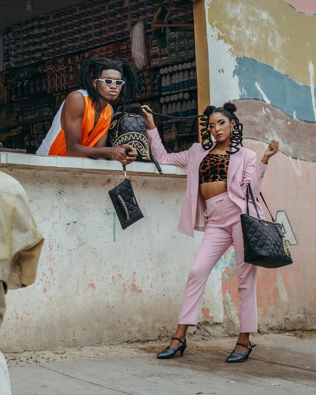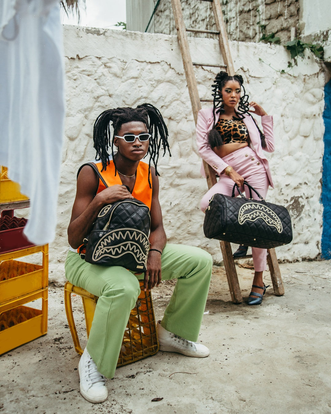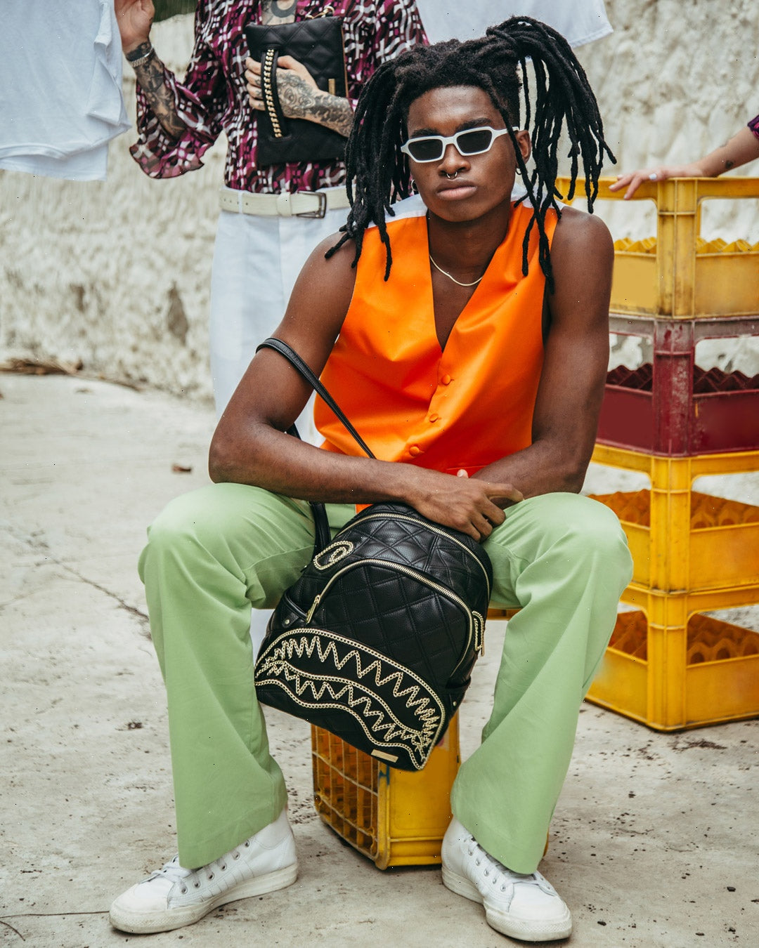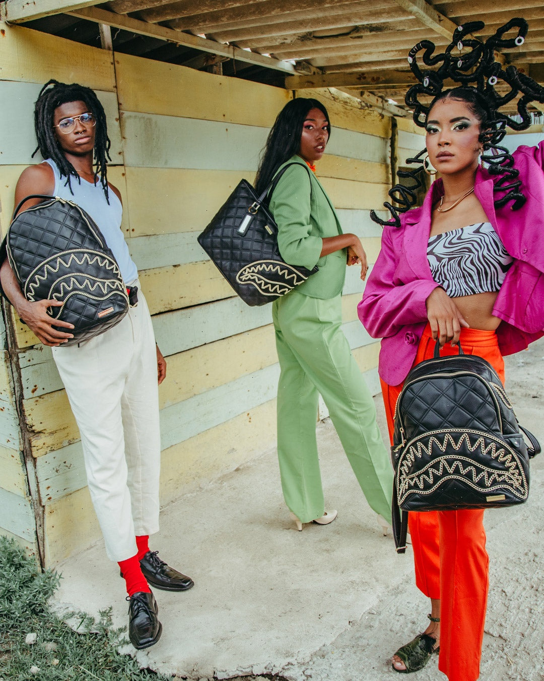 Dimensions: 10" x 5" x 11.5" ? Two large main zippered compartments ? Side pockets ? Zippered Stash pocket ? Adjustable straps for custom sizing ? Gold zippers with metal hardware