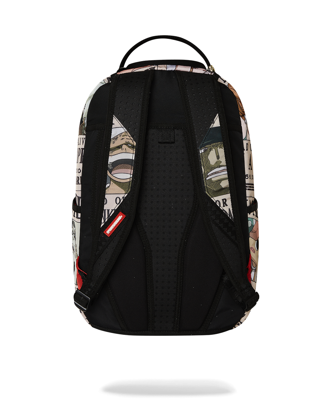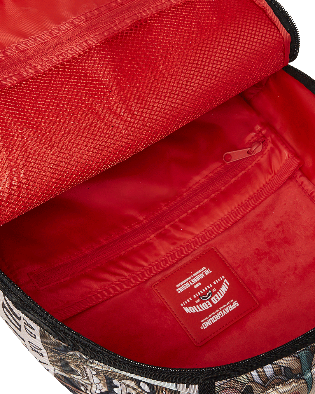 Dimensions: 18" x 6" x 11.5" ? Front zipper pocket ? Side pockets ? Zippered Stash pocket ? Separate velour sunglass compartment ? Ergonomic mesh back padding ? Adjustable Straps for custom sizing ? Gold zippers with metal hardware ? Metal "Sprayground Authentic" badge ? Slide through back sleeve connects to carry-on luggage to free your hands