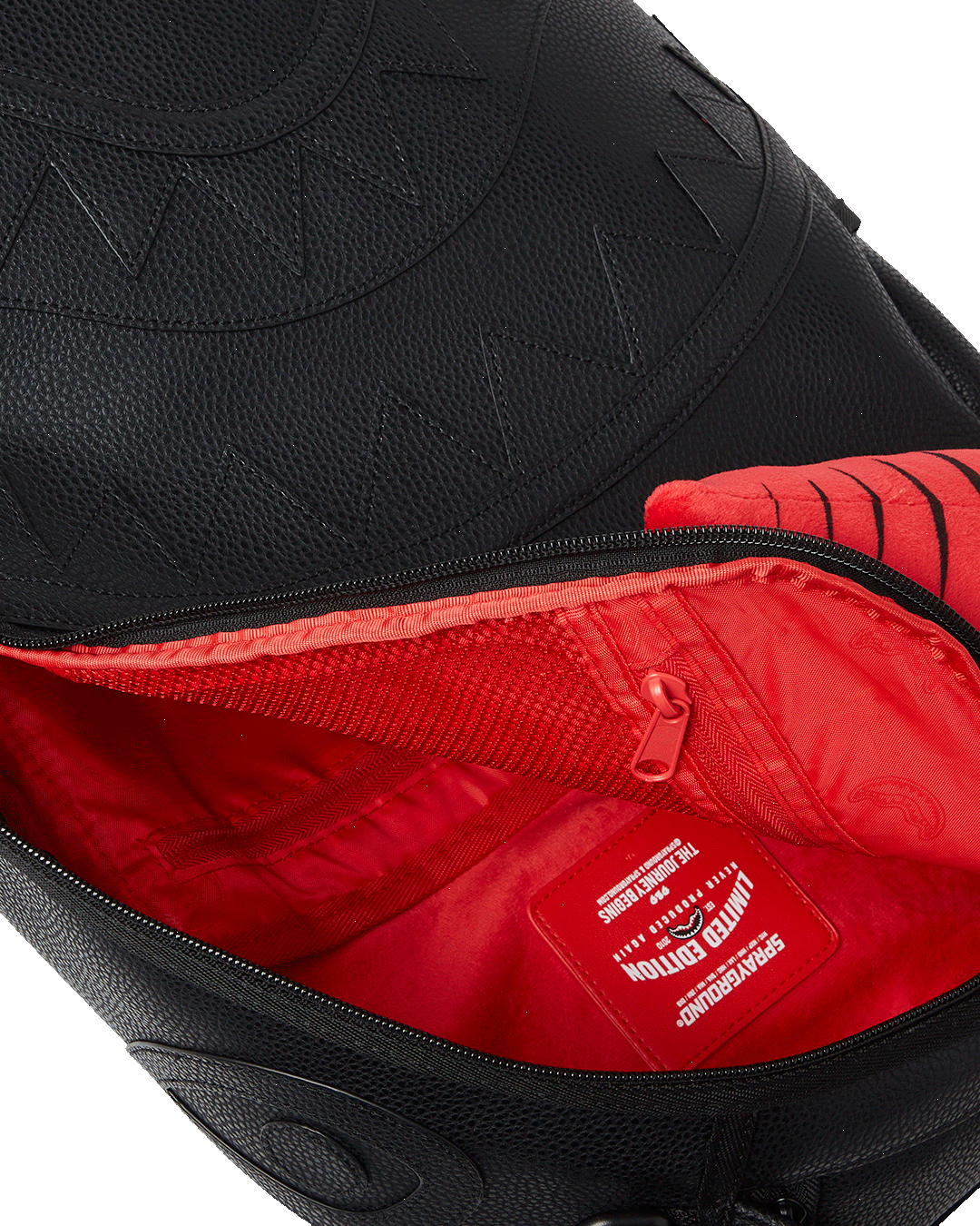 Dimensions: 18" x 6" x 11.5" ? Front zipper pocket ? Side pockets ? Zippered Stash pocket ? Separate velour sunglass compartment ? Ergonomic mesh back padding ? Adjustable Straps for custom sizing ? Gold zippers with metal hardware ? Metal "Sprayground Authentic" badge ? Slide through back sleeve connects to carry-on luggage to free your hands