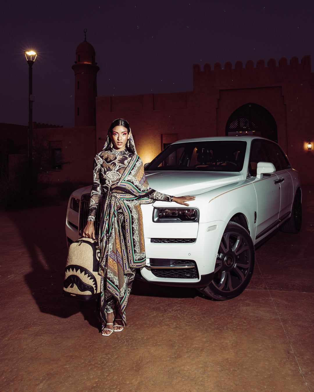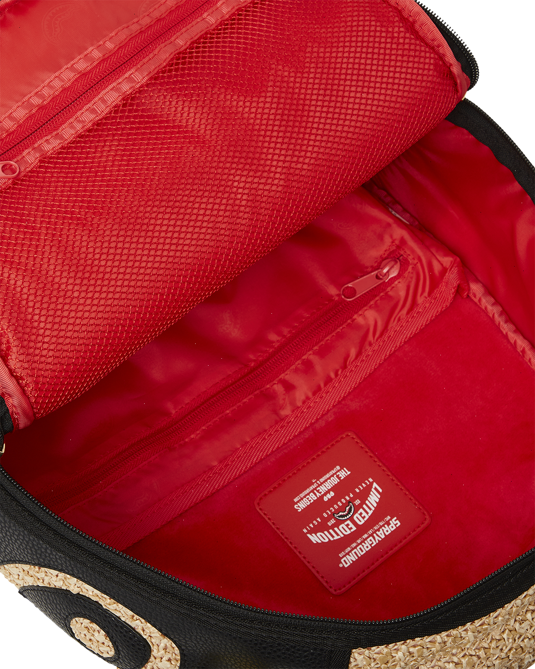 Dimensions: 18" x 6" x 11.5" ? Front zipper pocket ? Side pockets ? Zippered Stash pocket ? Separate velour sunglass compartment ? Ergonomic mesh back padding ? Adjustable Straps for custom sizing ? Gold zippers with metal hardware ? Metal "Sprayground Authentic" badge ? Slide through back sleeve connects to carry-on luggage to free your hands