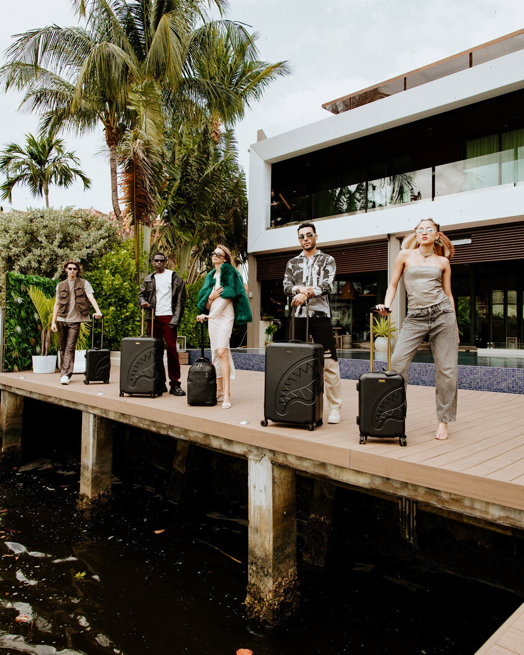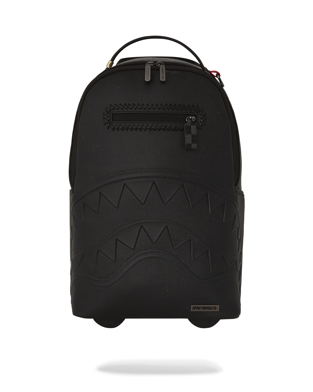 Whip stitch front zipper detail and embossed sharkmouth, wheels for traveling, bottom of straps can be unhooked to keep clean while rolling, easy zippered compartment for handle storage, suitcase handle sleeve, padded laptop compartment, interior mesh zipper, flat base, embossed zipper pulls, whip stitch luggage tag