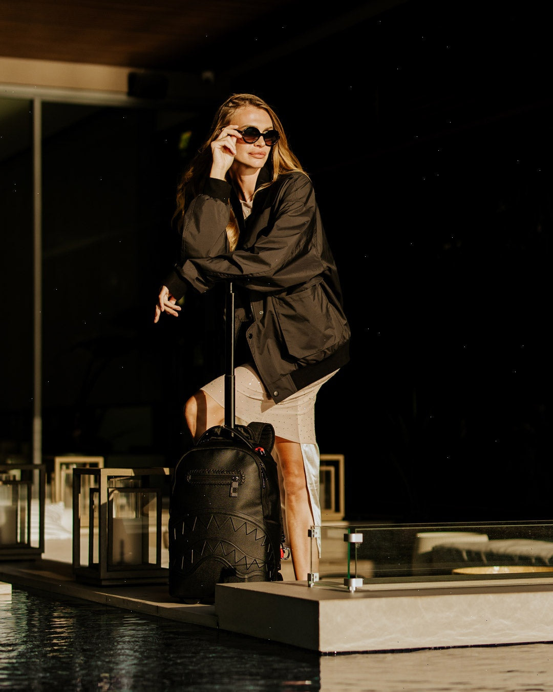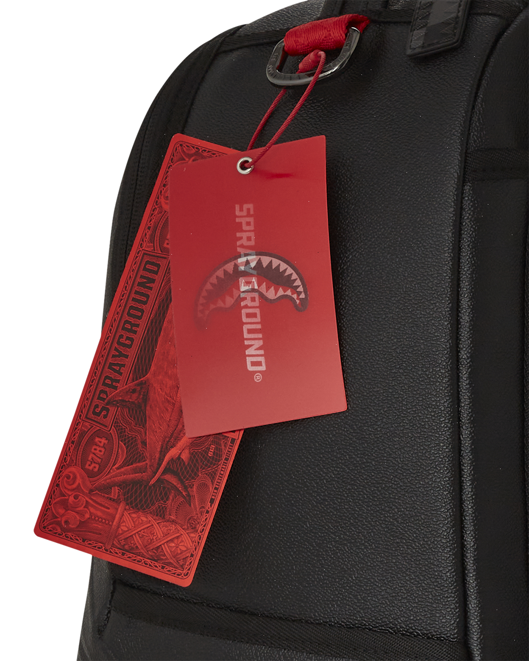 Dimensions: 19" H X 12" W X 7" D? ? Front zipper pocket ? Side pockets ? Zippered Stash pocket ? Separate velour sunglass compartment ? Ergonomic mesh back padding ? Adjustable Straps for custom sizing ? Gold zippers with metal hardware ? Metal "Sprayground Authentic" badge ? Slide through back sleeve connects to carry-on luggage to free your hands