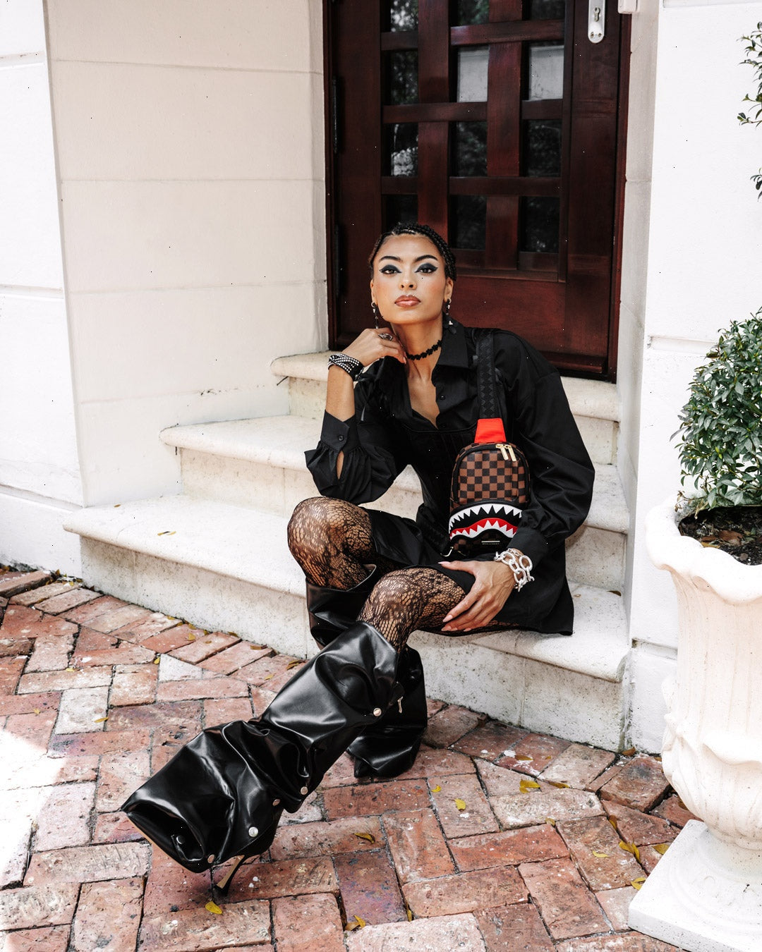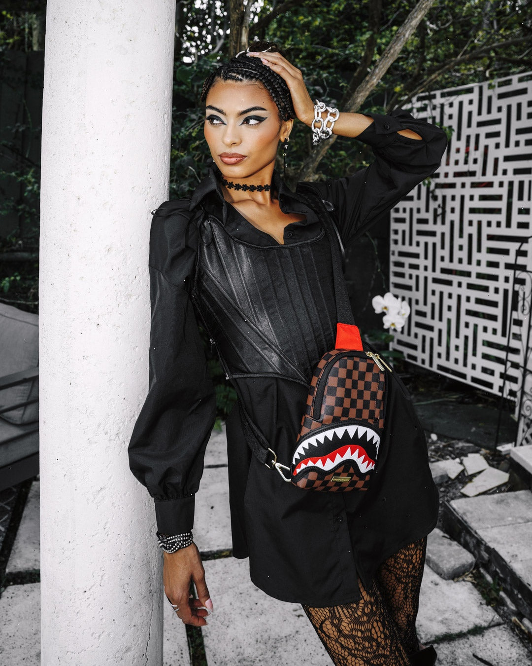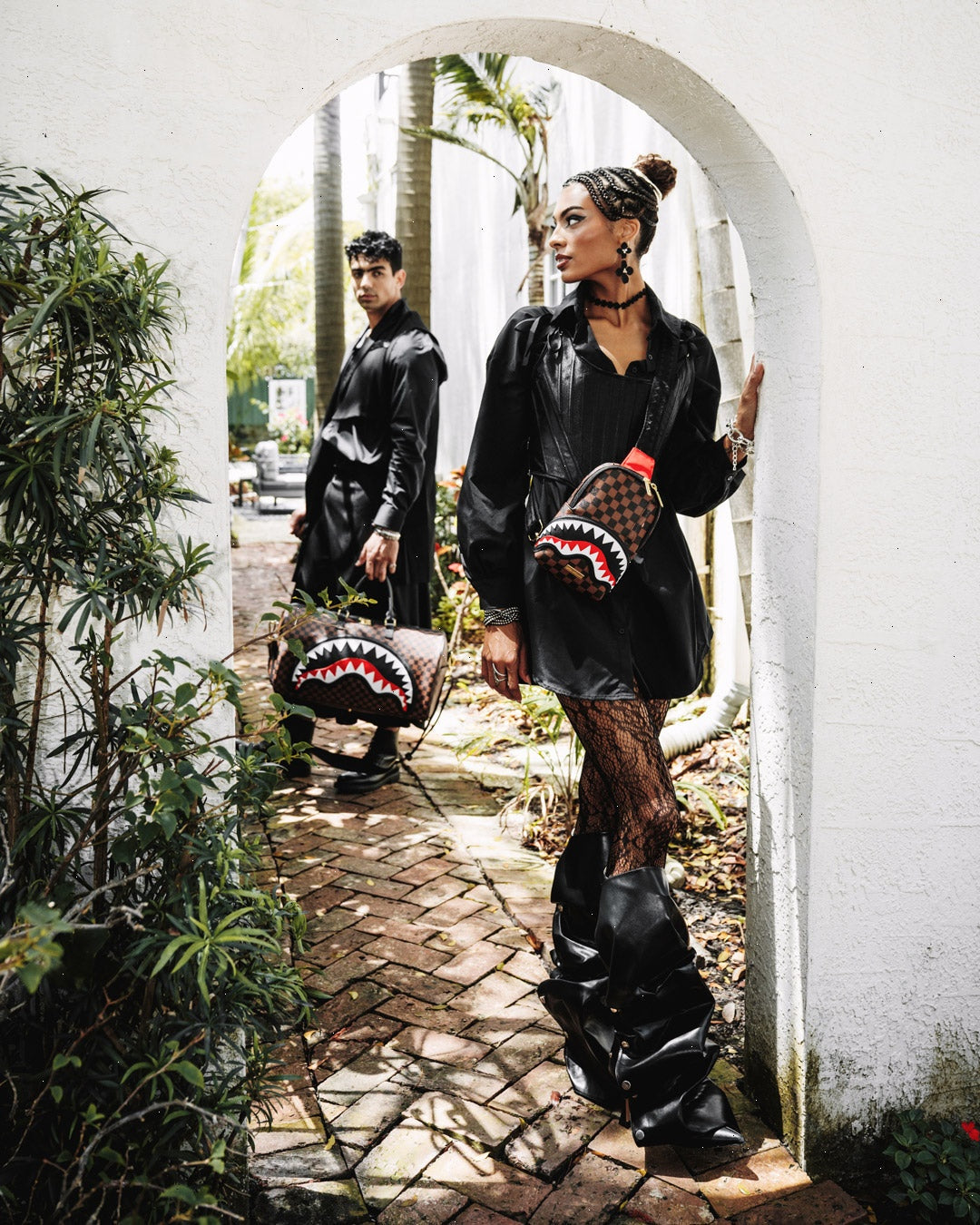 NEW SILHOUETTE: Mini convertible crossbody pouch with adjustable strap, one interior pocket, two exterior pockets, and cut and sew sharkmouth
