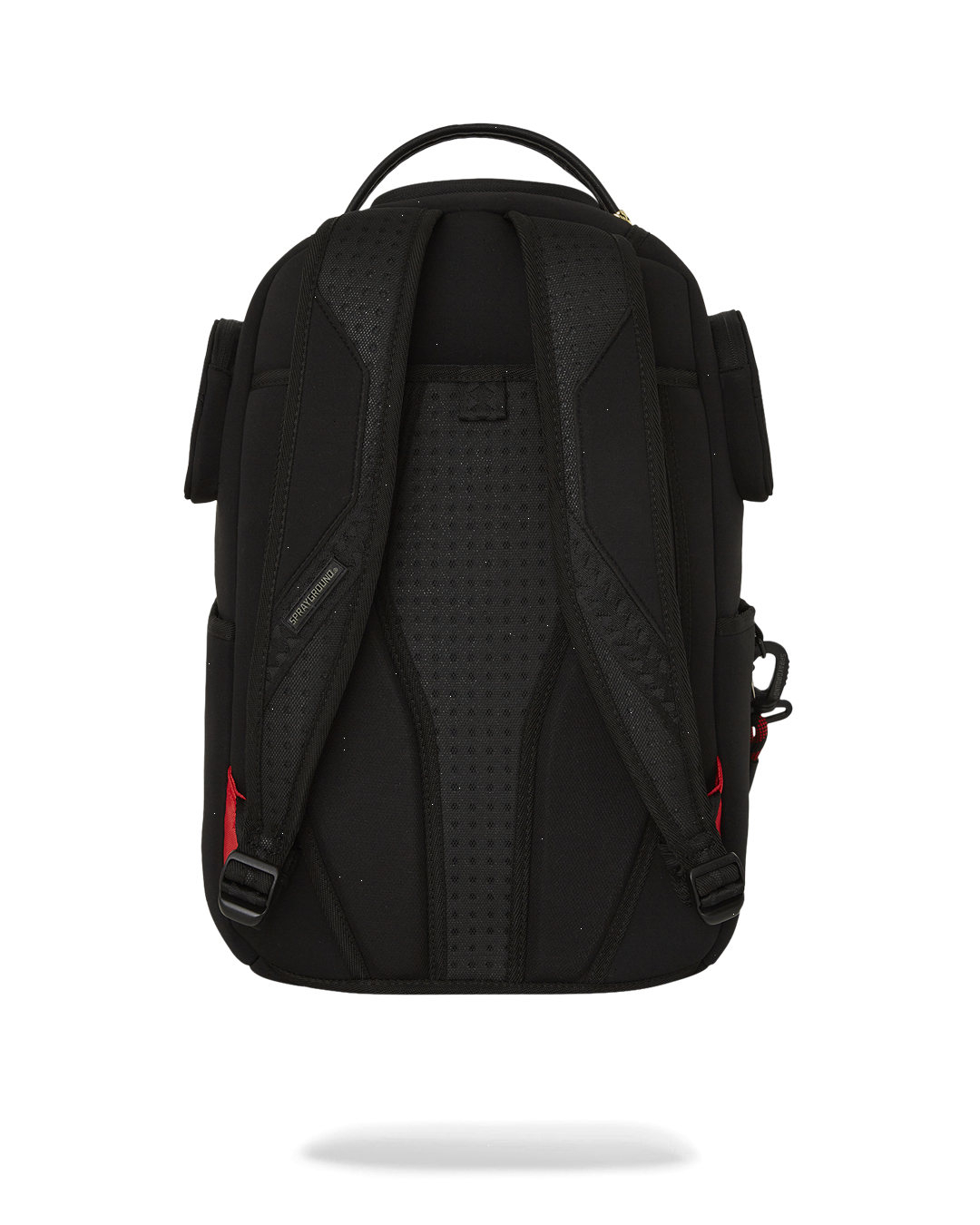 Dimensions: 18" x 6" x 11.5" ? Front zipper pocket ? Side pockets ? Zippered Stash pocket ? Separate velour sunglass compartment ? Ergonomic mesh back padding ? Adjustable Straps for custom sizing ? Gold zippers with metal hardware ? Metal "Sprayground Authentic" badge ? Slide through back sleeve connects to carry-on luggage to free your hands