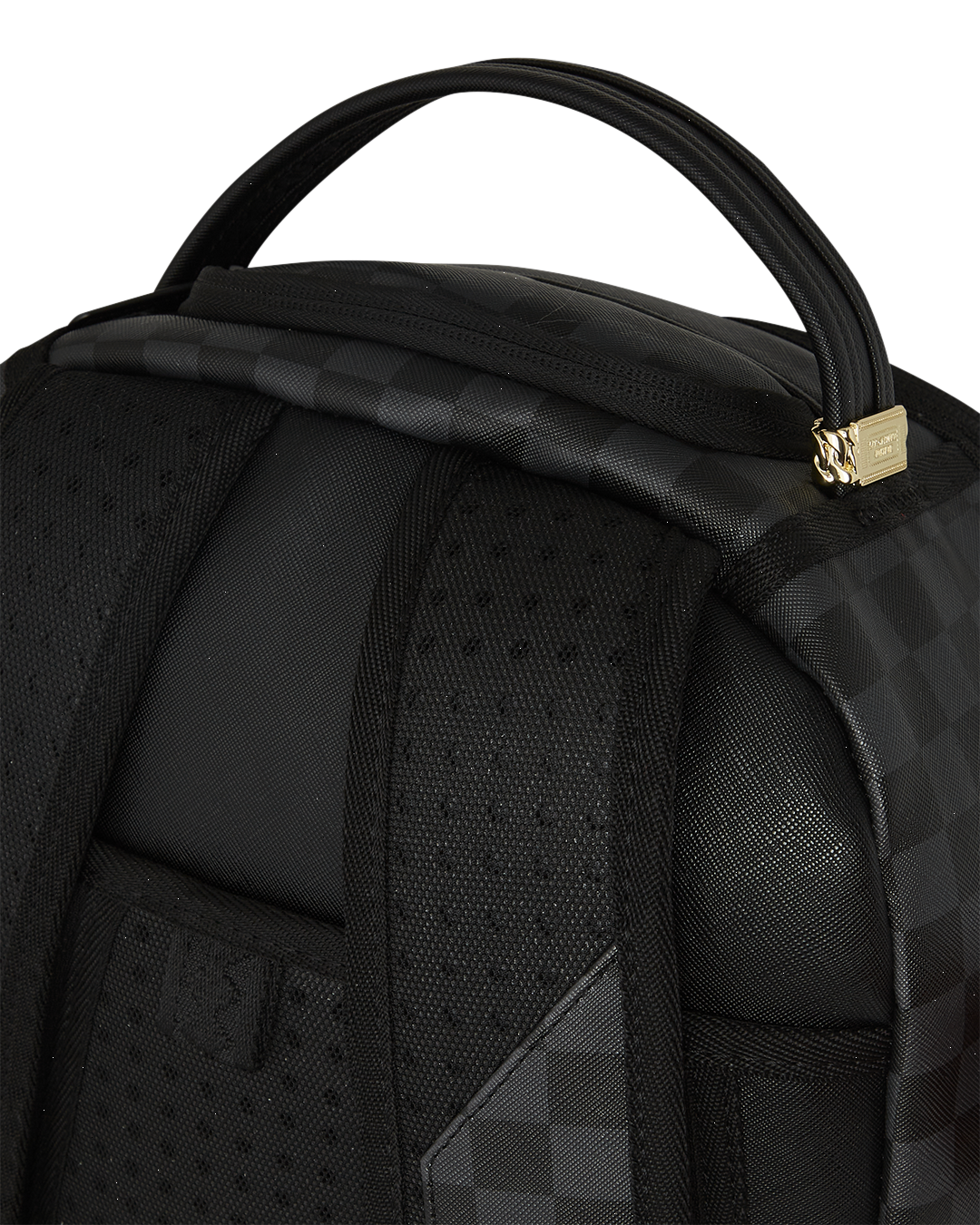 Dimensions: 18" x 8" x 25" ? Front zipper pocket ? Side pockets ? Zippered Stash pocket ? Separate velour sunglass compartment ? Ergonomic mesh back padding ? Adjustable Straps for custom sizing ? Gold zippers with metal hardware ? Metal "Sprayground Authentic" badge ? Slide through back sleeve connects to carry-on luggage to free your hands