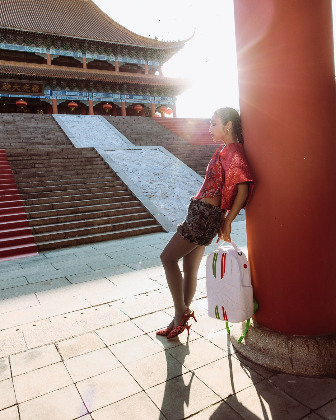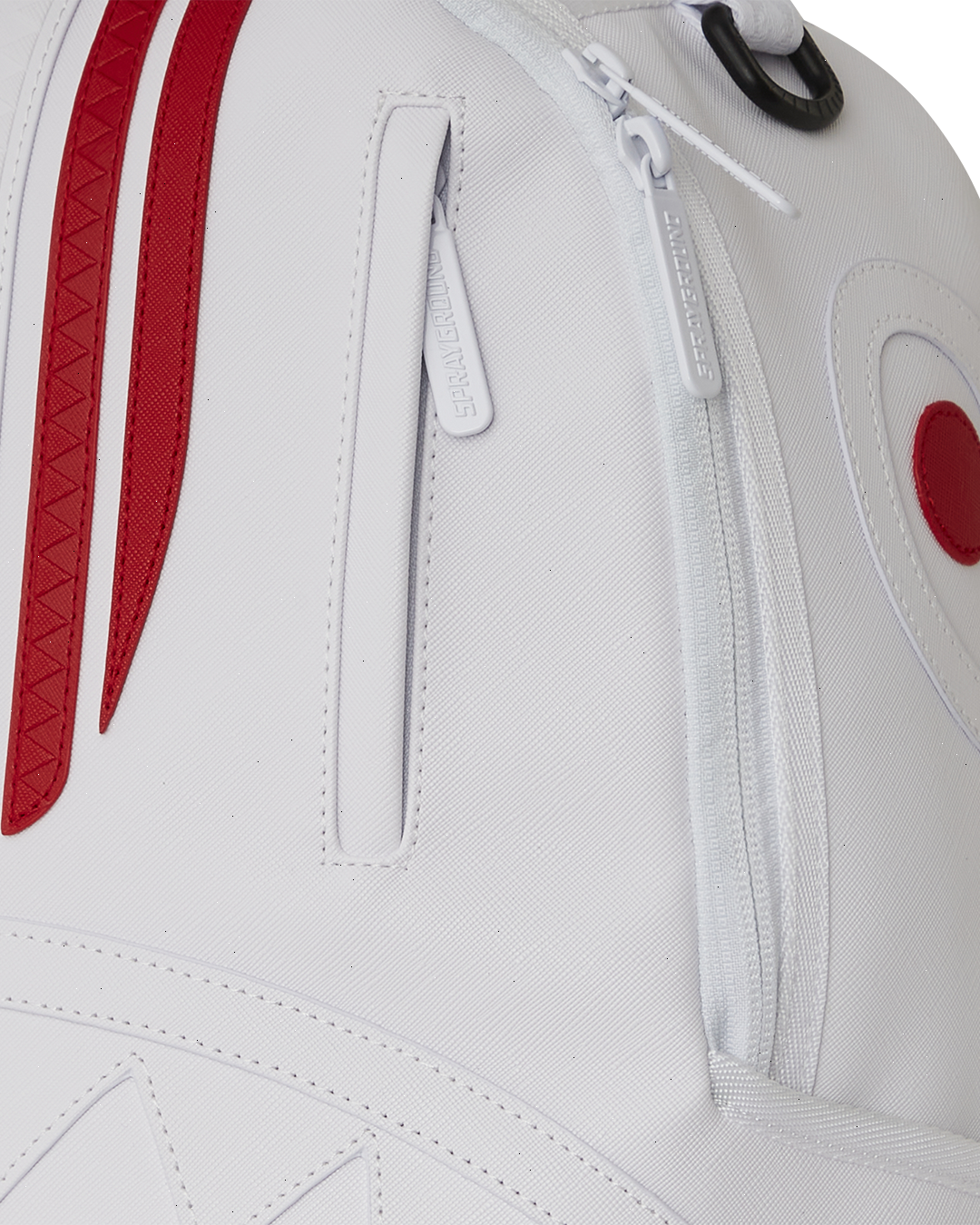 Dimensions: 18" x 6" x 11.5" ? Front zipper pocket ? Side pockets ? Zippered Stash pocket ? Separate velour sunglass compartment ? Ergonomic mesh back padding ? Adjustable Straps for custom sizing ? Gold zippers with metal hardware ? Metal "Sprayground Authentic" badge ? Slide through back sleeve connects to carry-on luggage to free your hands