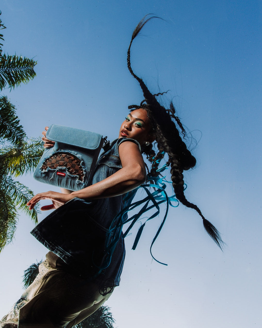 100% cotton denim bag with embossed details such as the sharkmouth and zipper pullers. Sewn faux leather details around the front zipper pocket. Adjustable strap.