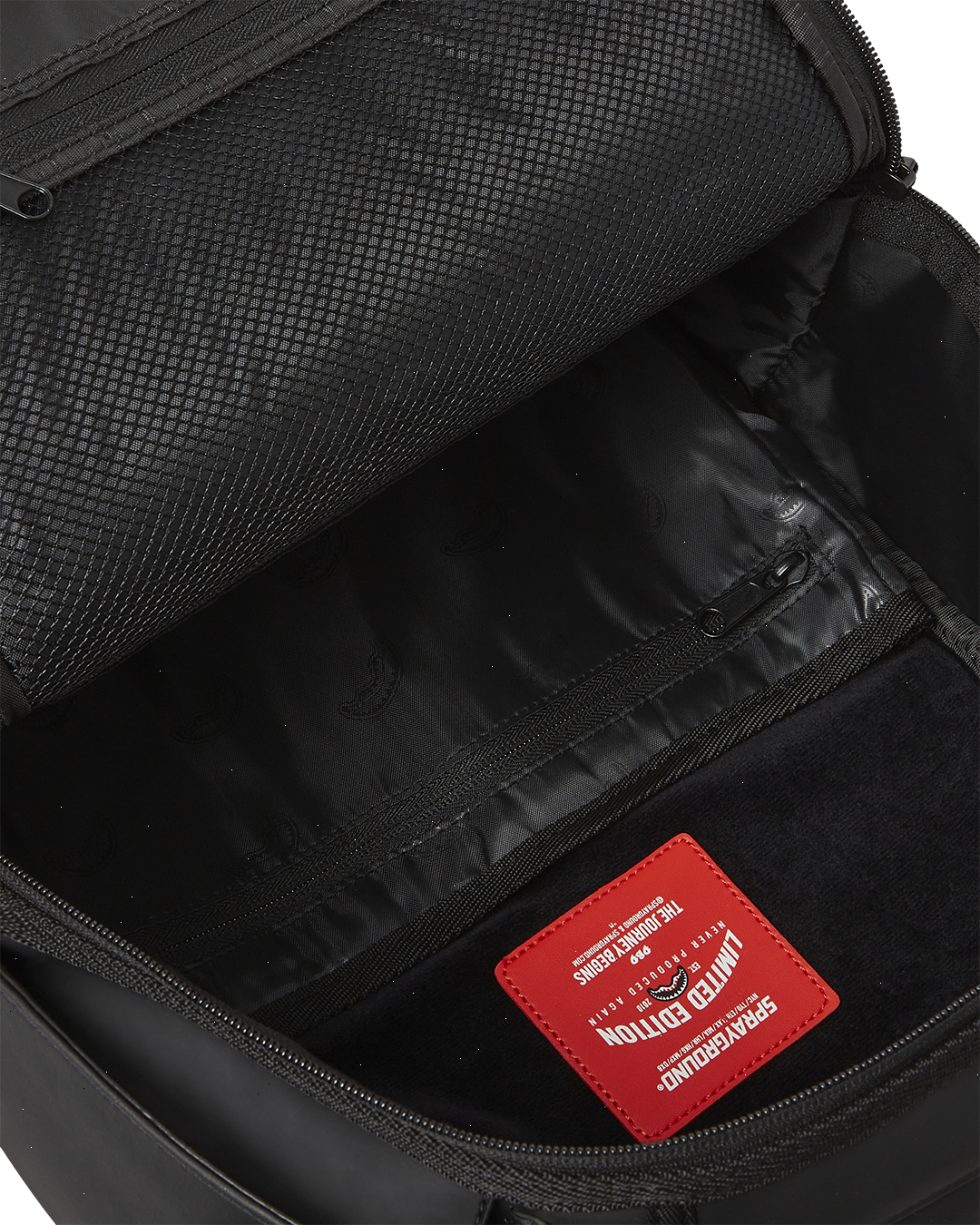 Dimensions: 18" x 6" x 11.5" ? Front zipper pocket ? Side pockets ? Zippered Stash pocket ? Separate velour sunglass compartment ? Ergonomic mesh back padding ? Adjustable Straps for custom sizing ? Gold zippers with metal hardware ? Metal "Sprayground Authentic" badge ? Slide through back sleeve connects to carry-on luggage to free your hands