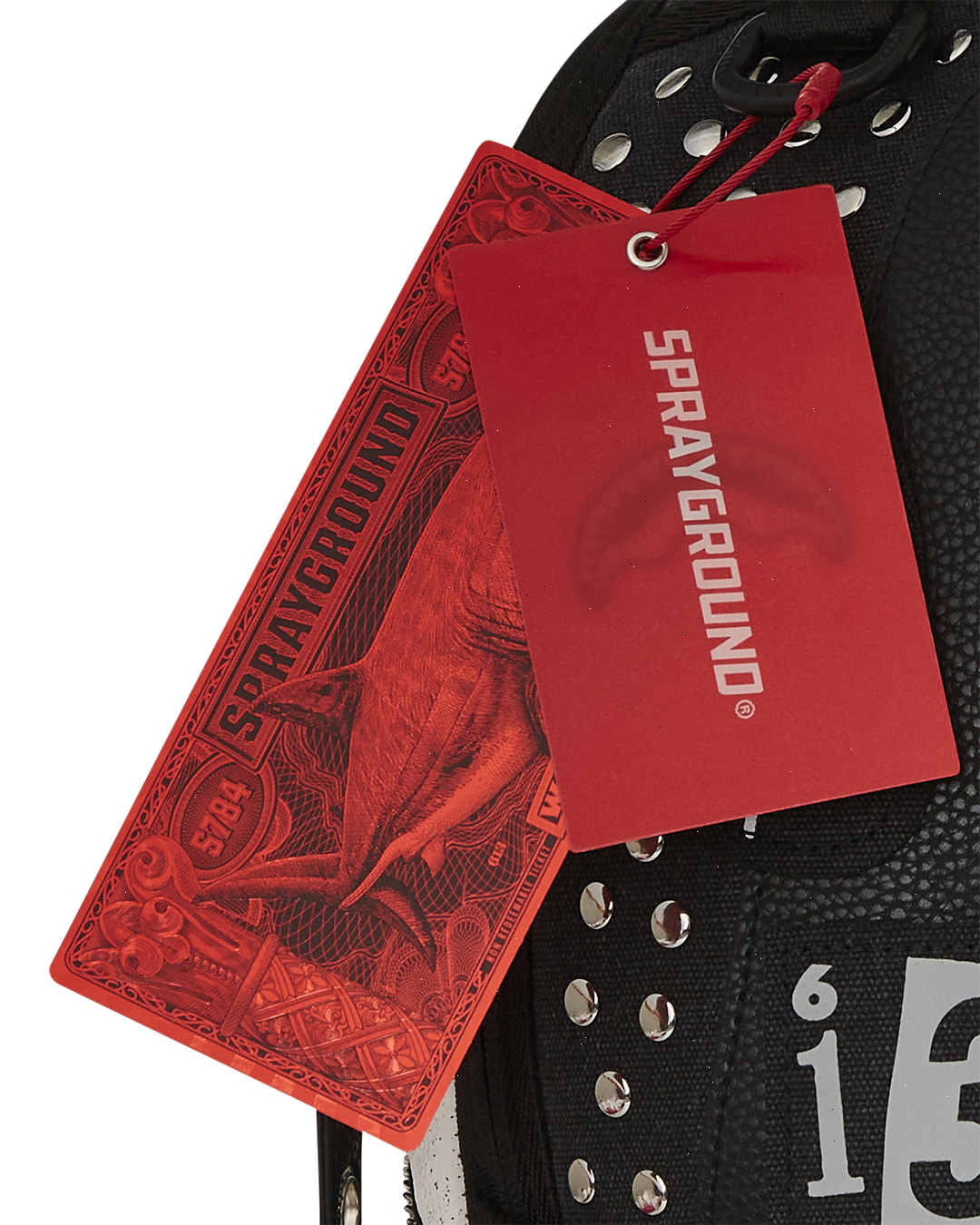 Dimensions: 18" x 6" x 11.5" ? Front zipper pocket ? Side pockets ? Zippered Stash pocket ? Separate velour sunglass compartment ? Ergonomic mesh back padding ? Adjustable Straps for custom sizing ? Gold zippers with metal hardware ? Metal "Sprayground Authentic" badge ? Slide through back sleeve connects to carry-on luggage to free your hands