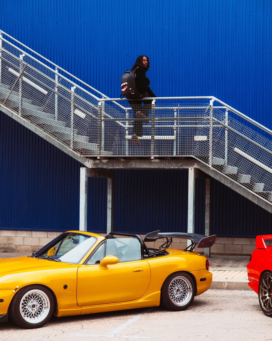 Dimensions: 18" x 6" x 11.5" ? Front zipper pocket ? Side pockets ? Zippered Stash pocket ? Separate velour sunglass compartment ? Ergonomic mesh back padding ? Adjustable Straps for custom sizing ? Gold zippers with metal hardware ? Metal "Sprayground Authentic" badge ? Slide through back sleeve connects to carry-on luggage to free your hands