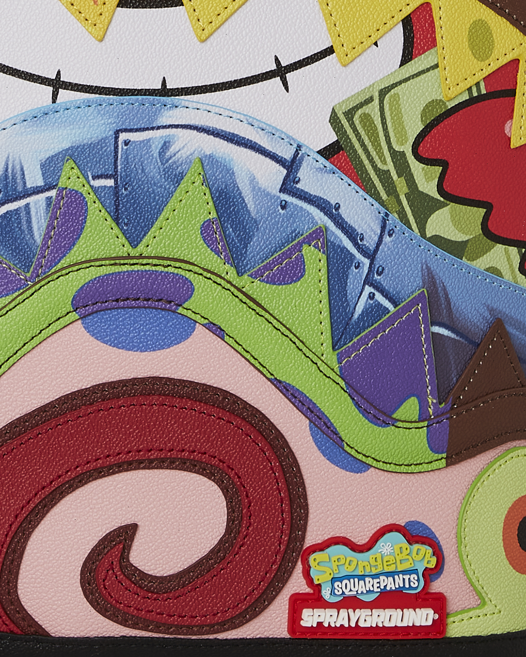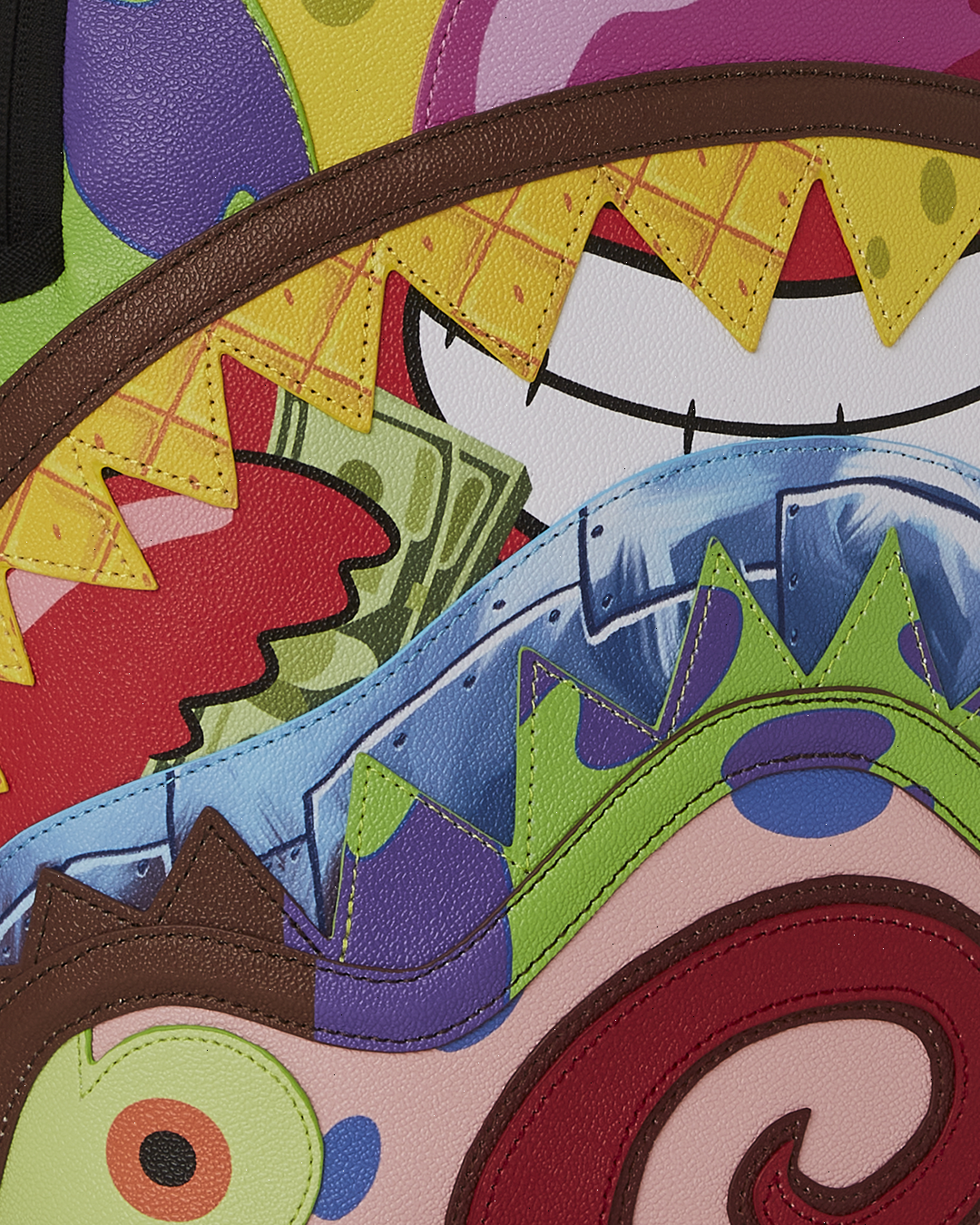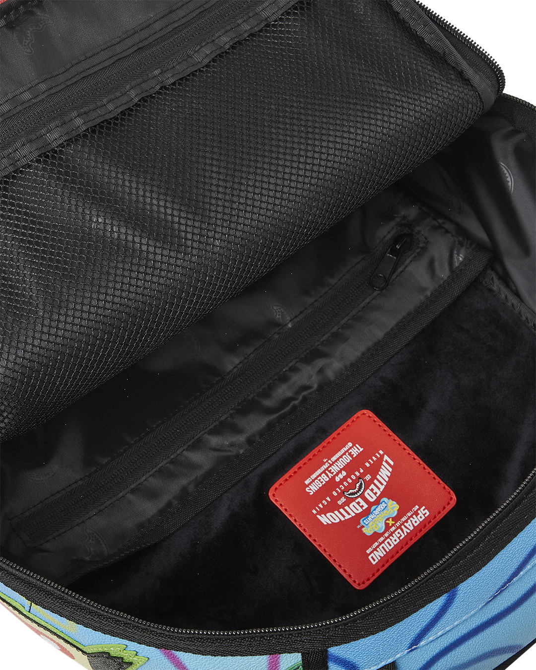 Dimensions: 18" x 6" x 11.5" ? Front zipper pocket ? Side pockets ? Zippered Stash pocket ? Separate velour sunglass compartment ? Ergonomic mesh back padding ? Adjustable Straps for custom sizing ? Gold zippers with metal hardware ? Metal "Sprayground Authentic" badge ? Slide through back sleeve connects to carry-on luggage to free your hands