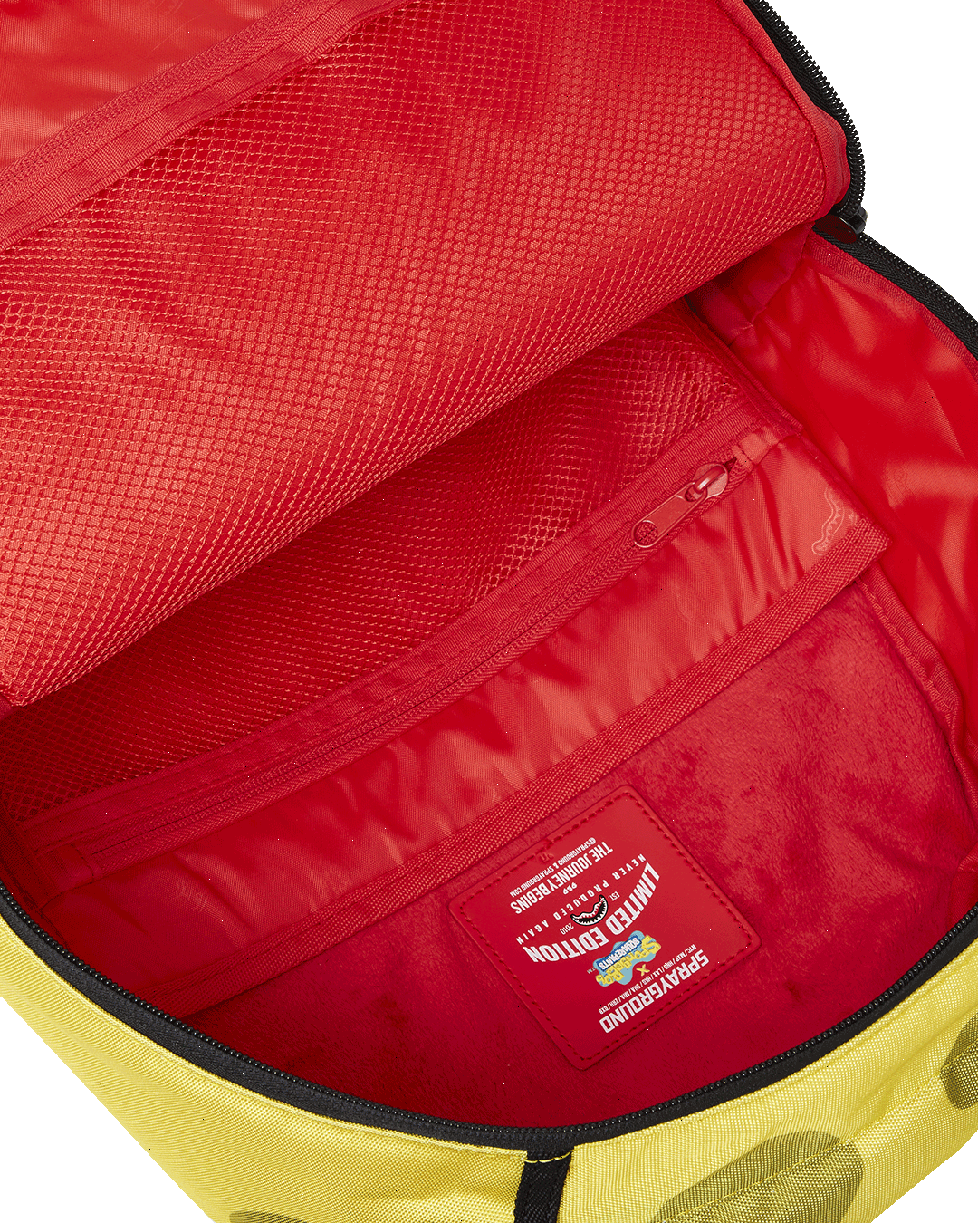Dimensions: 18" x 6" x 11.5" ? Front zipper pocket ? Side pockets ? Zippered Stash pocket ? Separate velour sunglass compartment ? Ergonomic mesh back padding ? Adjustable Straps for custom sizing ? Gold zippers with metal hardware ? Metal "Sprayground Authentic" badge ? Slide through back sleeve connects to carry-on luggage to free your hands