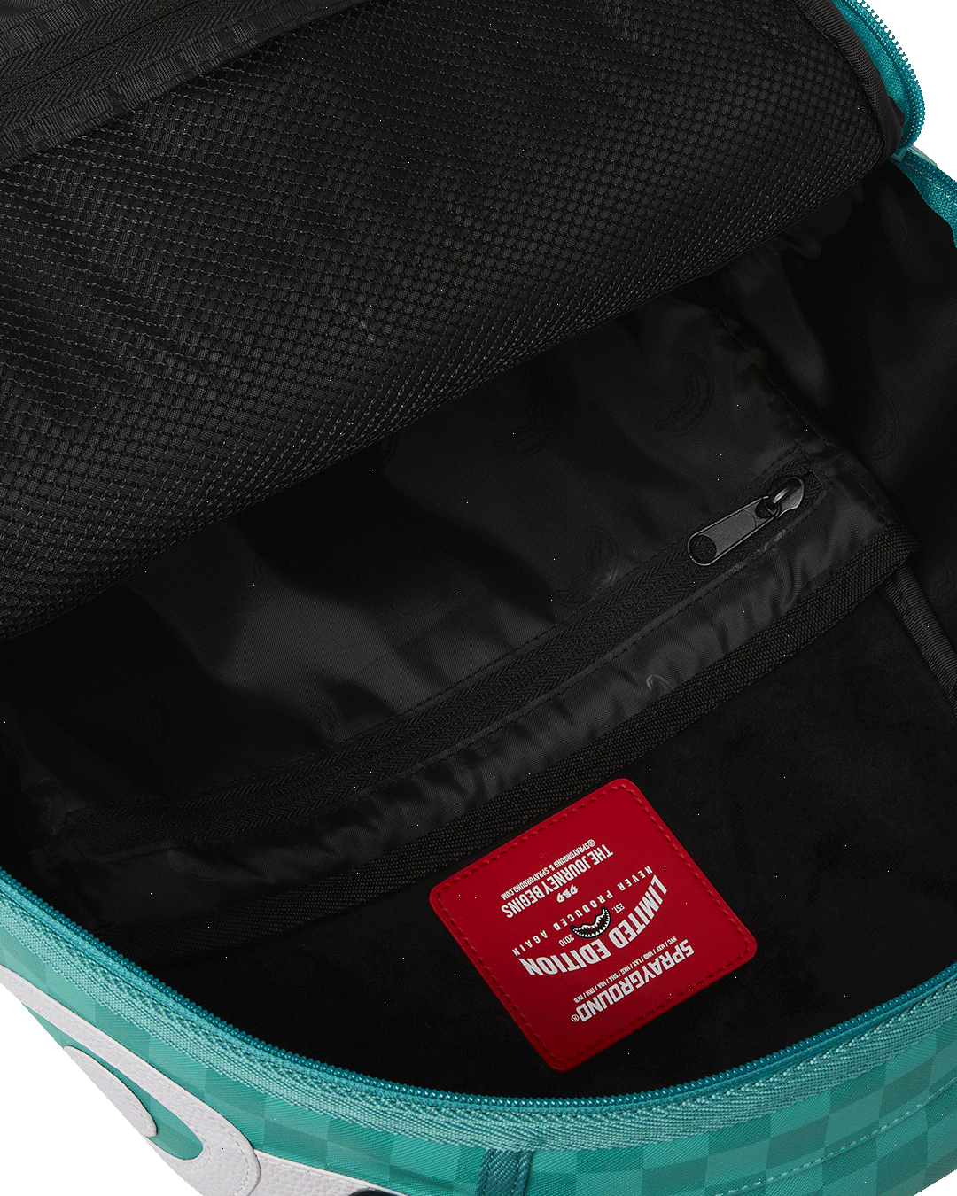 Dimensions: 18" x 6" x 11.5" ? Front zipper pocket ? Side pockets ? Zippered Stash pocket ? Separate velour sunglass compartment ? Ergonomic mesh back padding ? Adjustable Straps for custom sizing ? Gold zippers with metal hardware ? Metal "Sprayground Authentic" badge ? Slide through back sleeve connects to carry-on luggage to free your hands