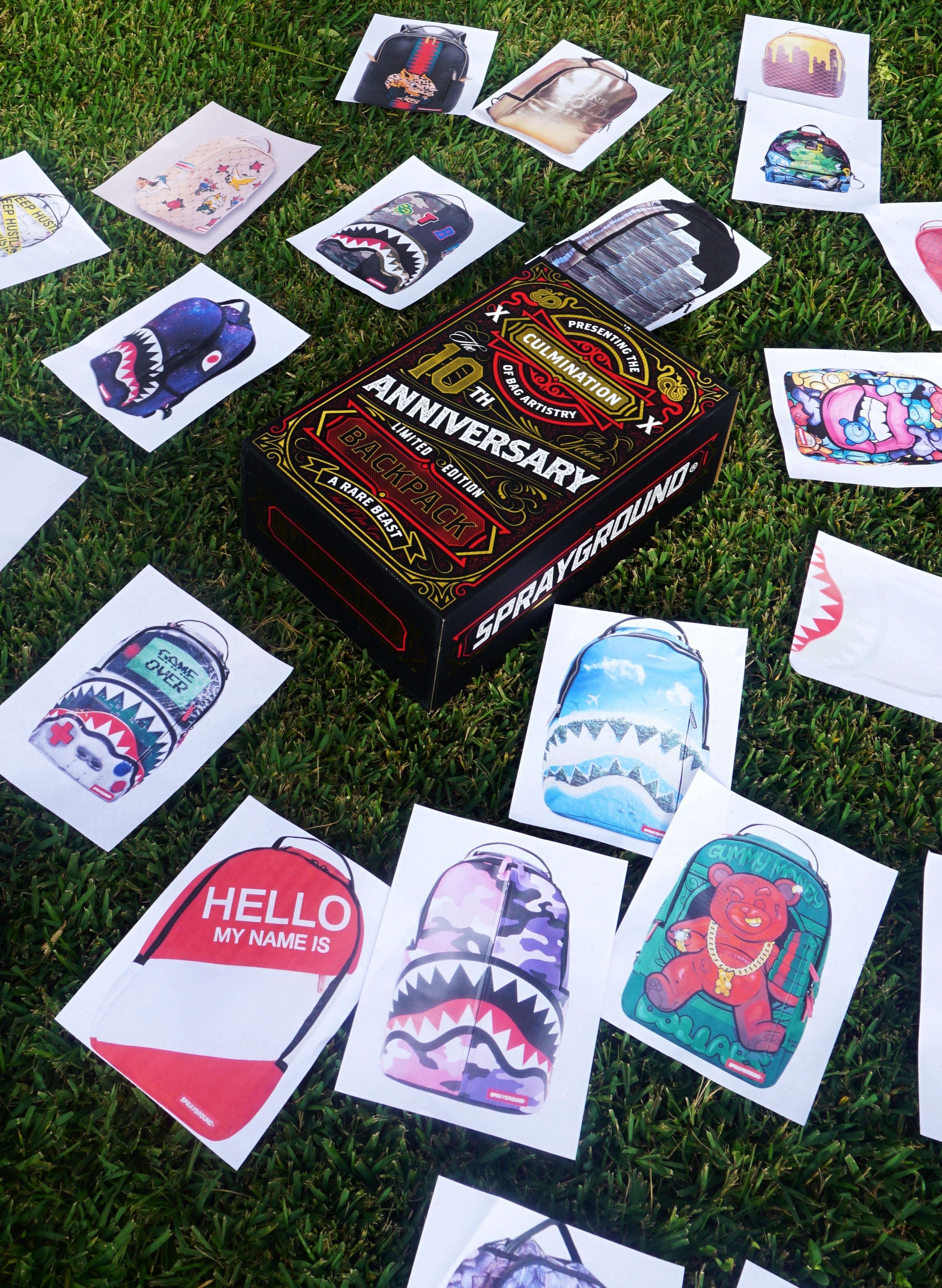 Sprayground Celebrates its 10 year anniversary with a very special bag that is super rare and limited of only 100 pcs. Each bag is numbered 1 of 100, 2 of 100, 3 of 10 and so on. The design is a culmination of 26 historical bags merged into 1. Cut & Sew and other detailed Fabrications.
