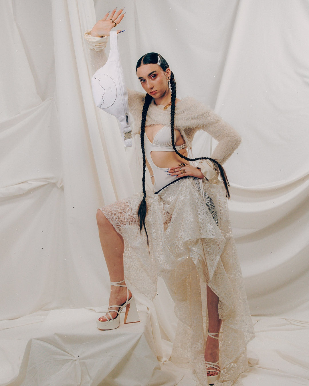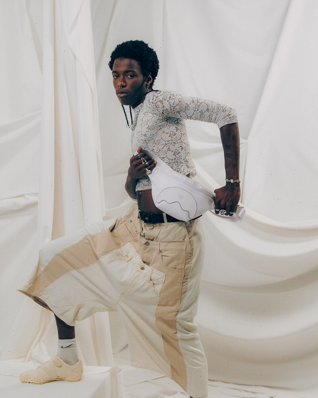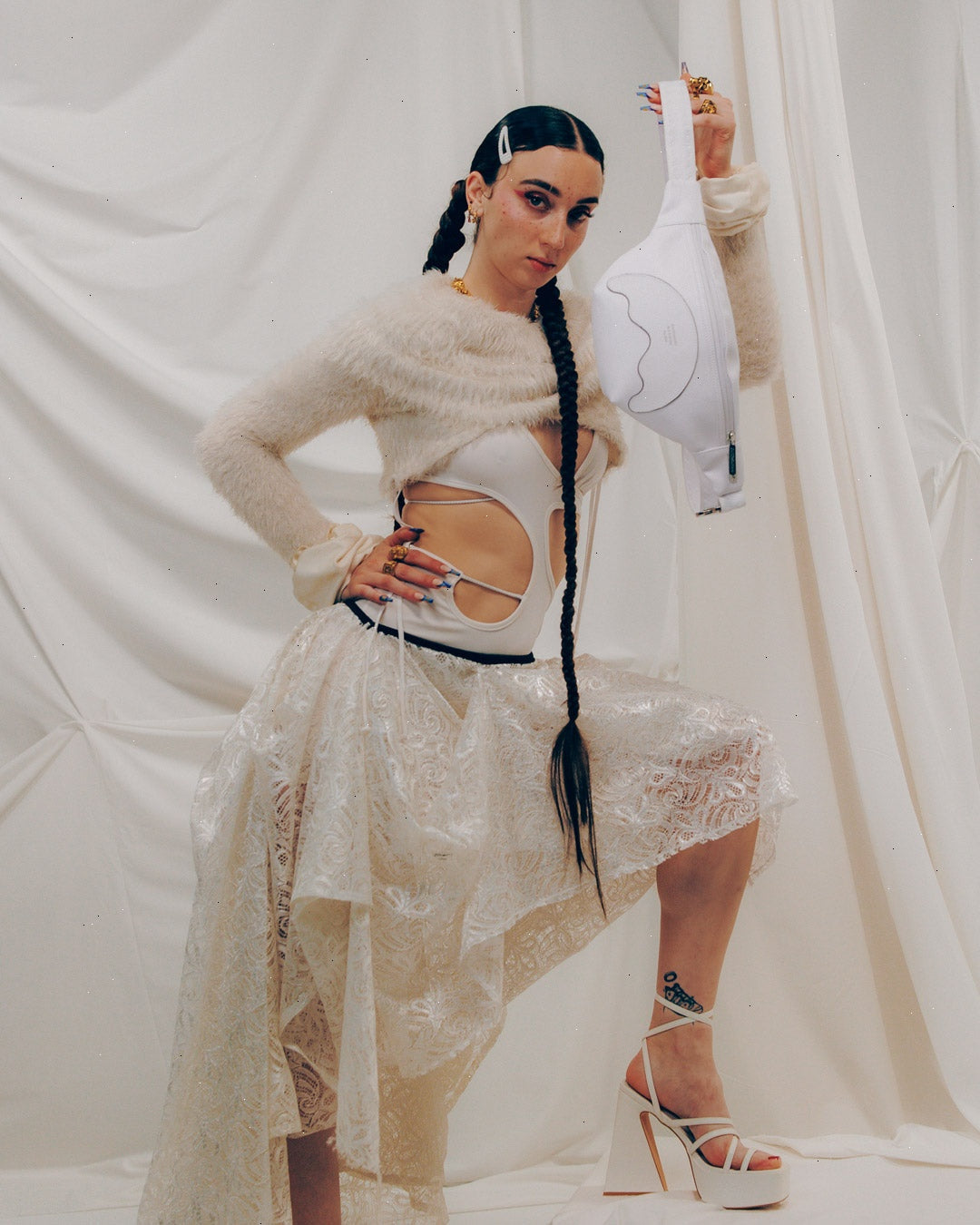 Cut and sew sharkmouth shape with embossed silver foil lettering.
